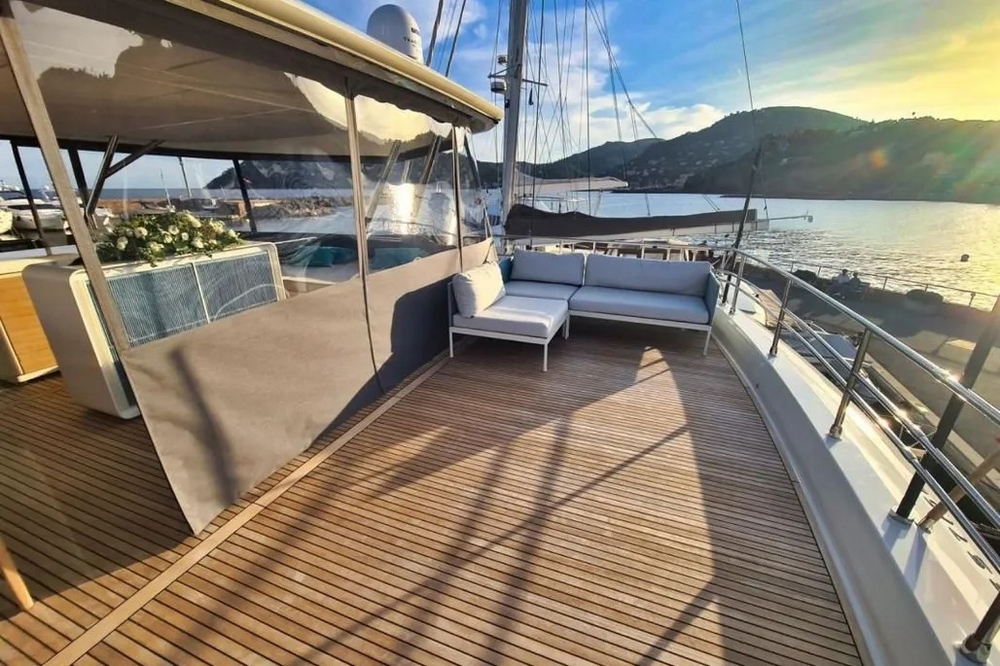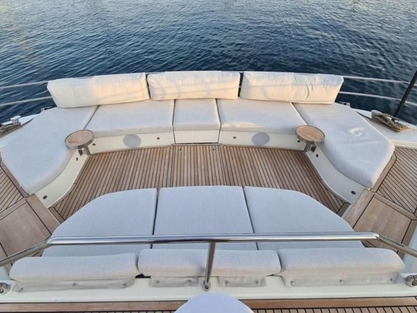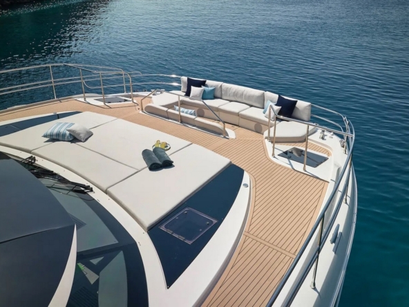 Le pont avant est également latté en teck. Il est aménagé avec un grand bain de soleil et un salon pleine largeur pouvant accueillir une dizaine de personnes. Il peut être ombragé par un auvent tendu entre quatre poteaux en carbone.
