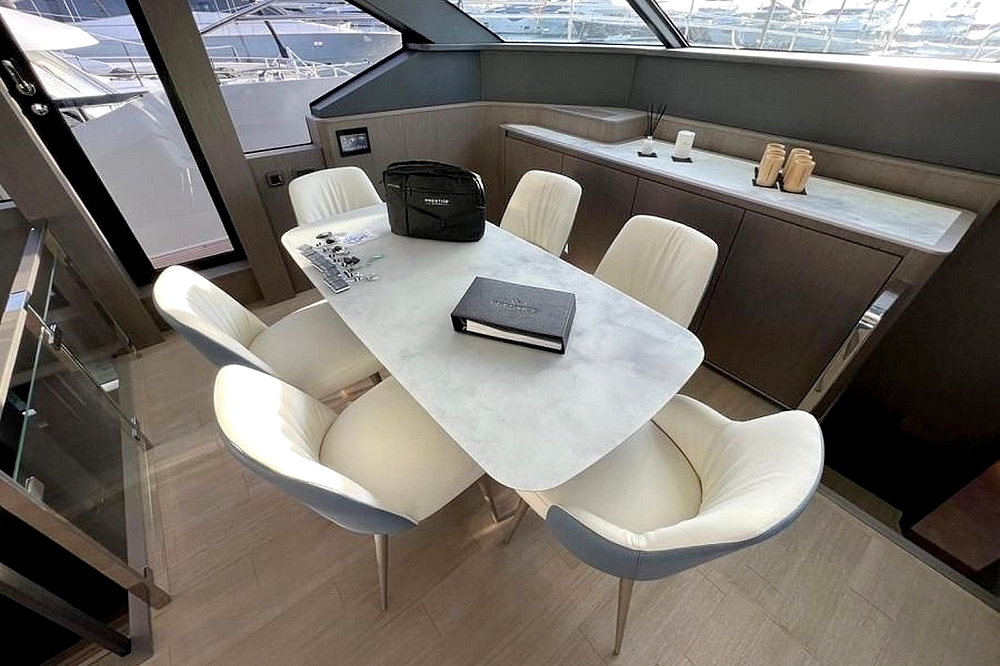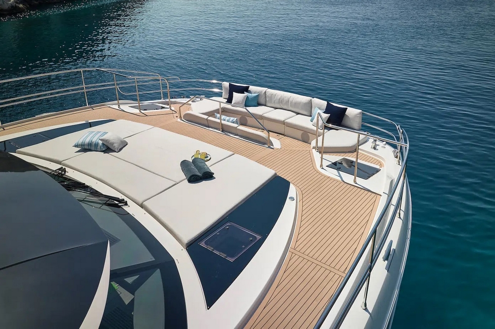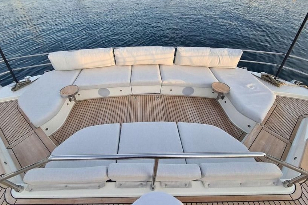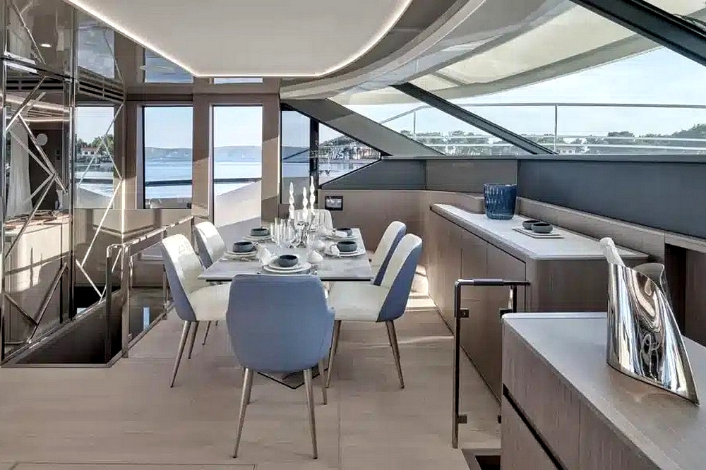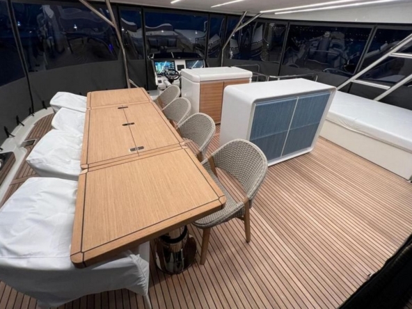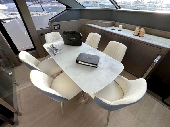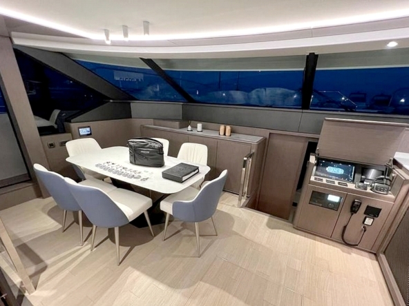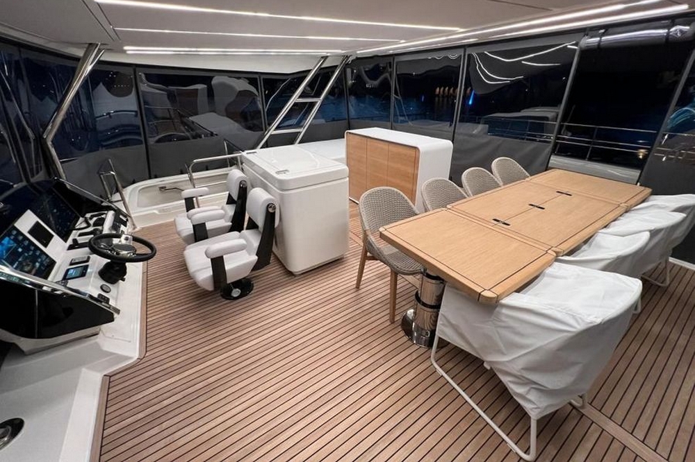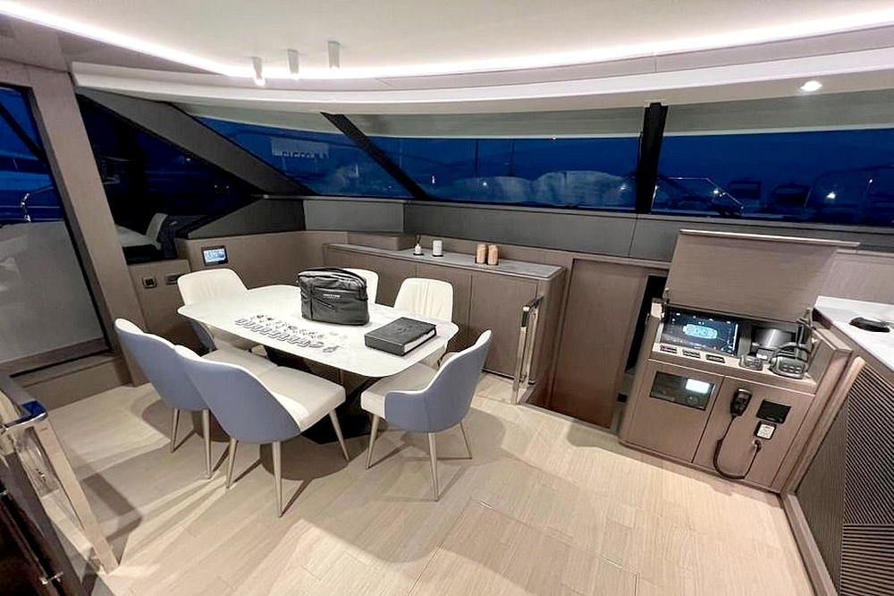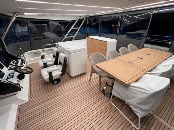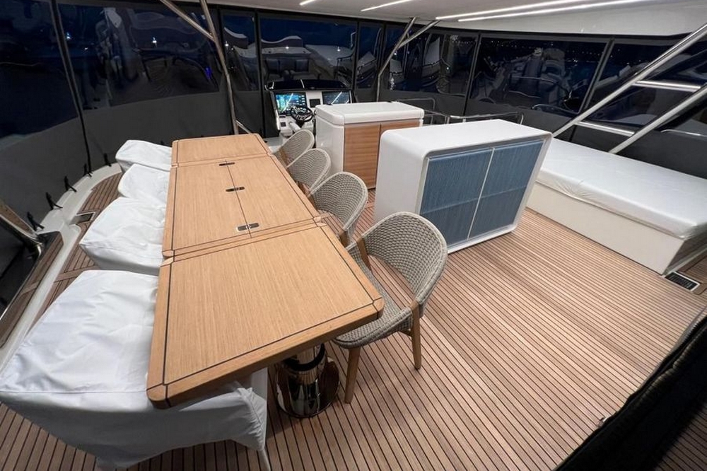 Le flybridge des entièrement latté en teck. Il est agencé avec un canapé en L à l’arrière, puis sous le hard-top rigide avec toit ouvrant électrique, le bar est au milieu équipé d’un évier, d’un barbecue, d’un réfrigérateur, et d’une machine à glaçons. Une salle à manger pour huit convives est à bâbord et un bain de soleil est à tribord. Le poste de pilotage central a une belle console avec tous les instruments, un volant sport, et deux confortables fauteuils de barre. Deux accès sont possibles, l’un depuis le cockpit et l’autre depuis le salon, et ce flybridge peut être intégralement fermé par des bâches amovibles.