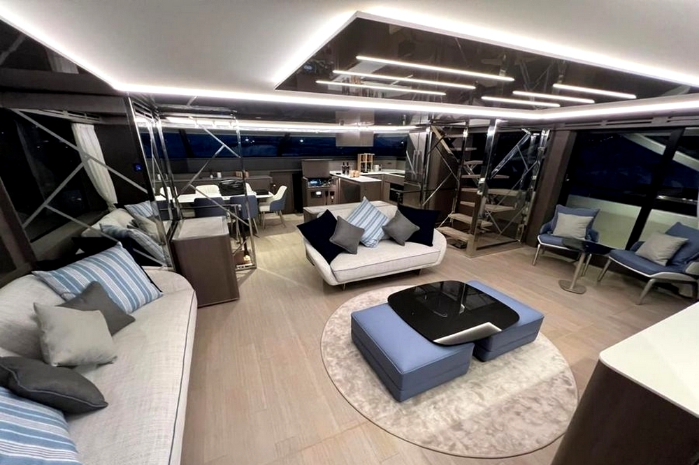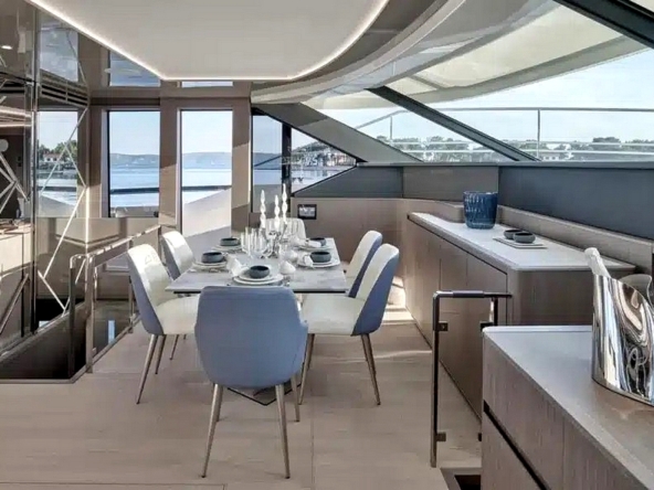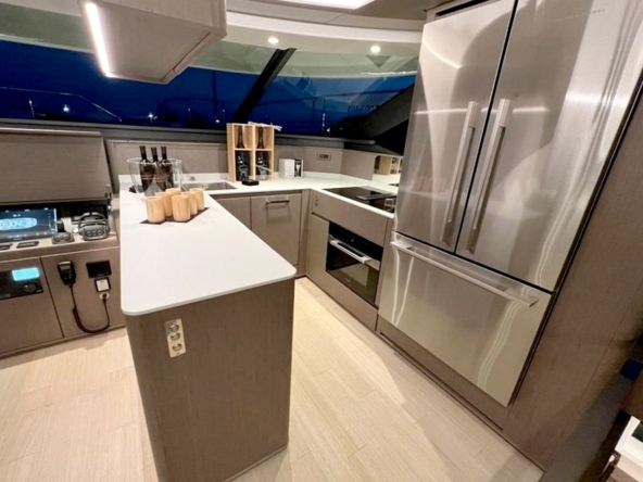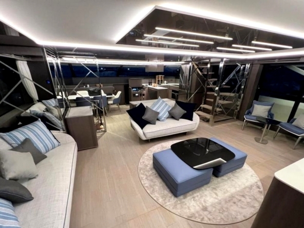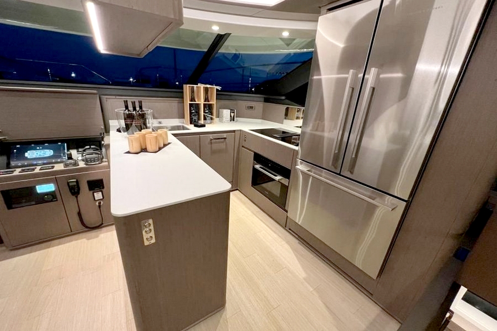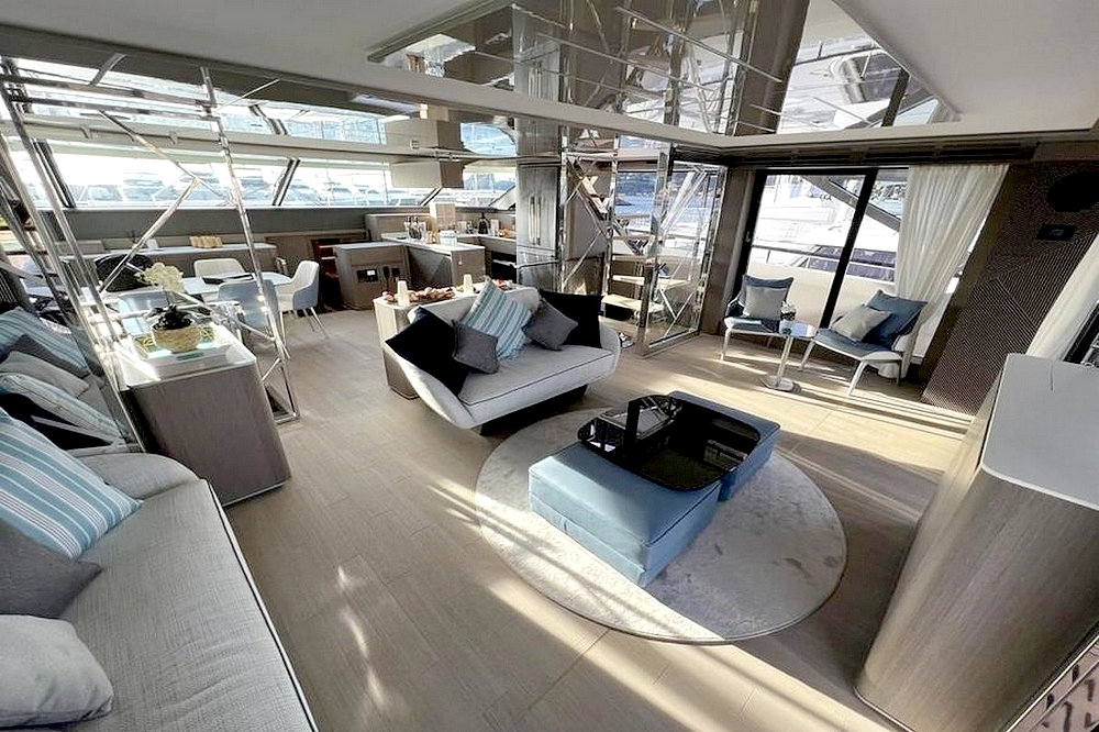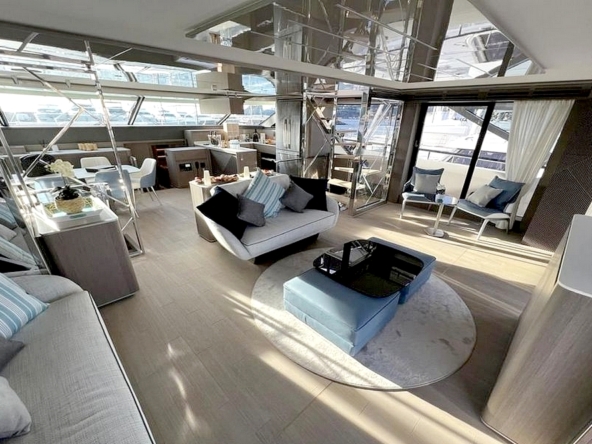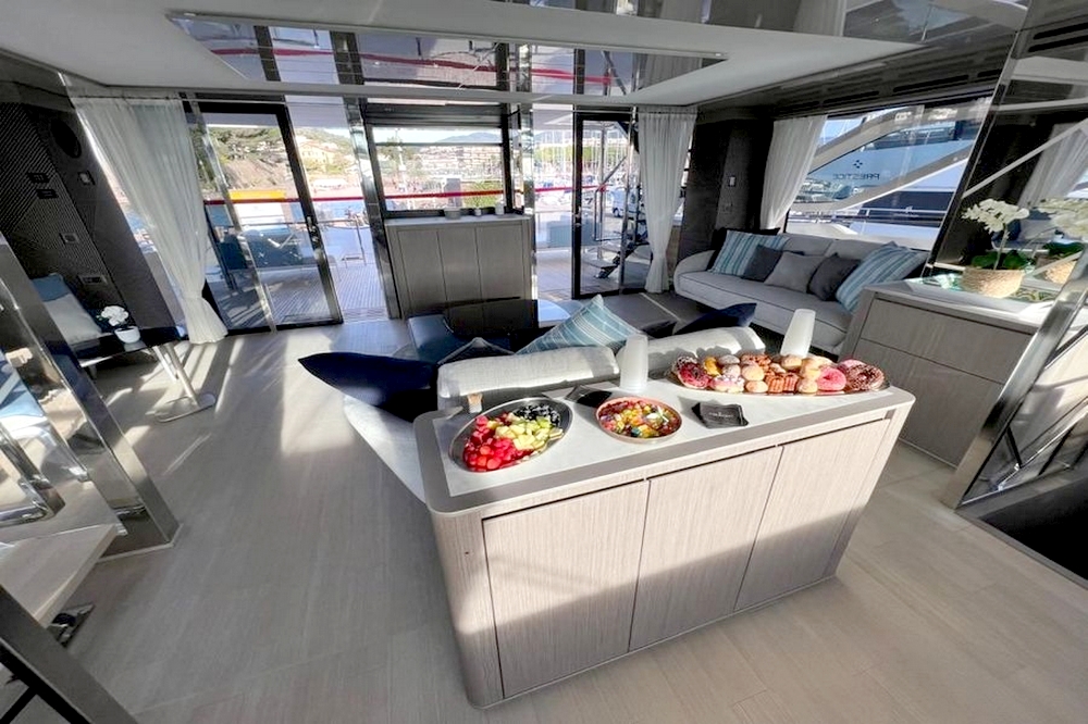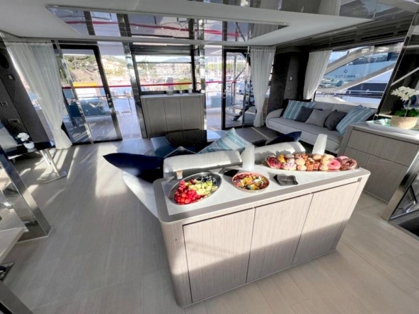 Le salon s’étendant sur toute la largeur, avec deux canapés, deux fauteuils, une table basse, et le téléviseur de 55 pouces. Un bar se trouve au milieu de l’espace avec, de part et d’autre, les escaliers menant aux cabines et au flybridge. A l’avant tribord, la cuisine ouverte en U est entièrement équipée avec évier double bac en inox, plaque à induction Miele, hotte aspirante Miele, four électrique Miele, lave-vaisselle, réfrigérateur/congélateur triple porte Fischer & Paykel de 500 litres, et une cave à vins. Le poste de pilotage et l’escalier d’accès à la suite du propriétaire se trouvent au milieu. La salle à manger est à bâbord avec une porte étanche donnant accès au passavant. La toilette de jour a sa porte d’accès à extérieur.