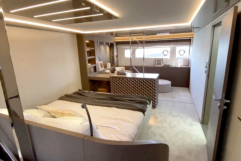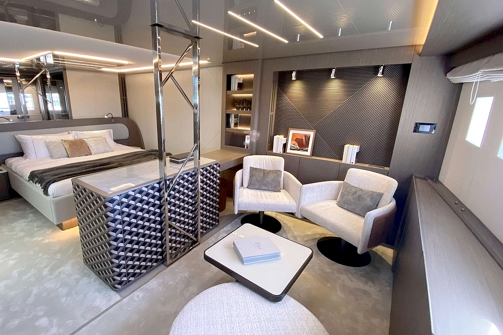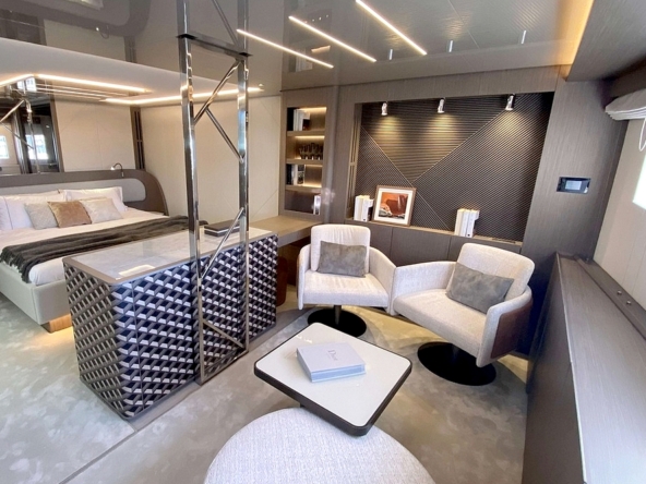 Dans le cockpit, trois canapés entourent des tables basses. Il est équipé avec un meuble bar incluant une machine à glaçons, d’éclairages LED, de haut-parleurs étanches, et d’un store rétractable. Le sol est en teck, comme la plateforme de baignade extensible de 4,20 m de large faisant également office de terrasse et de tender-lift. De grands coffres de rangement pour les jouets nautiques complètent l’équipement.