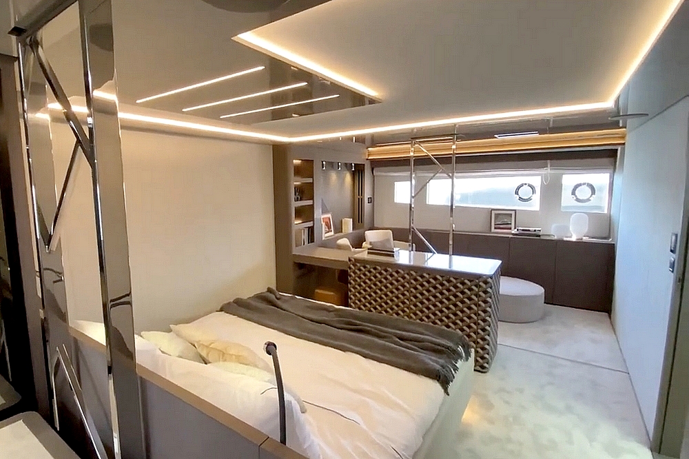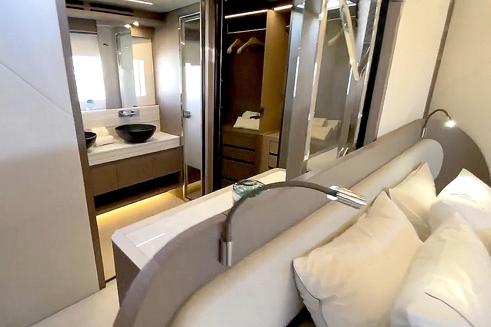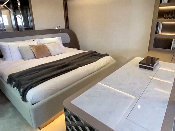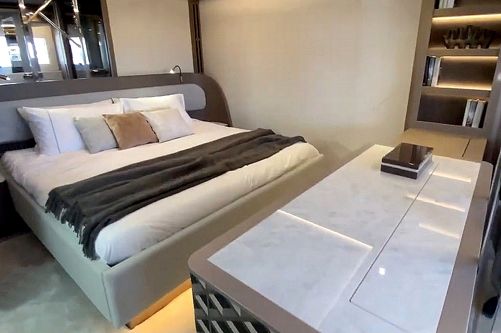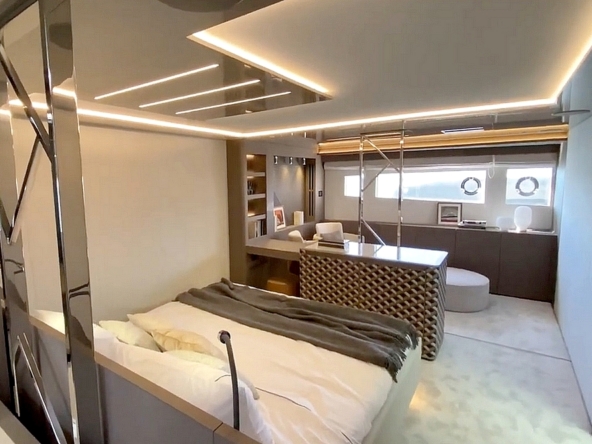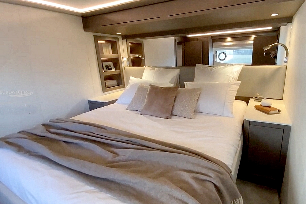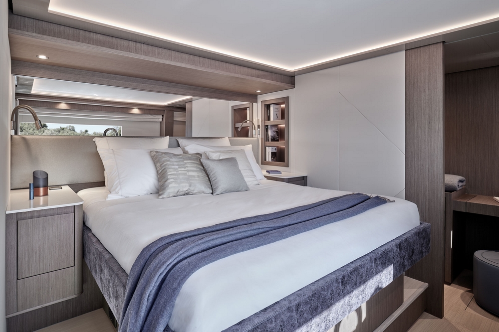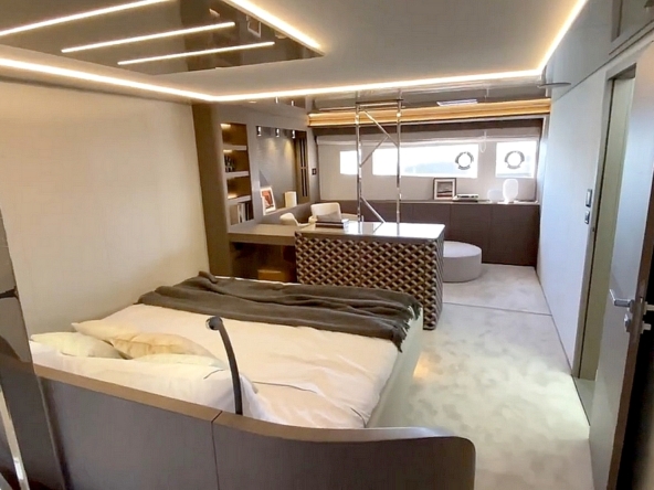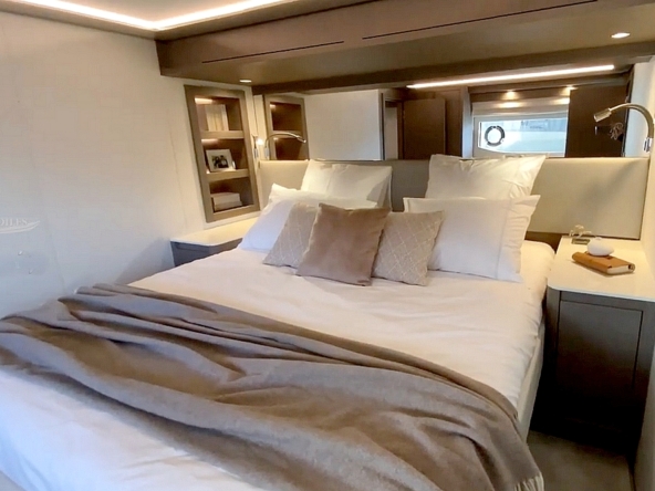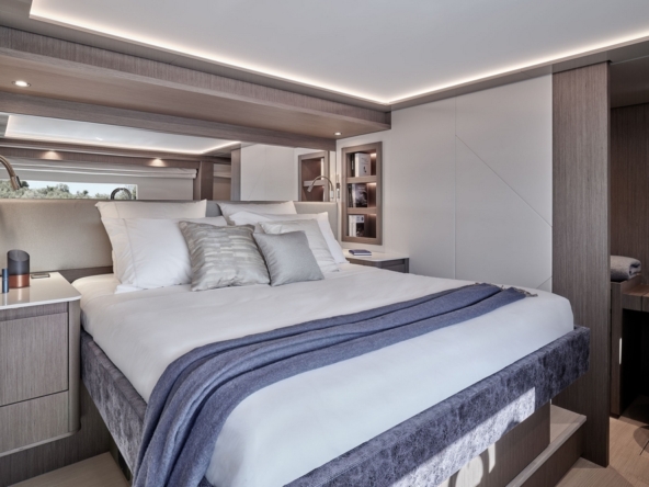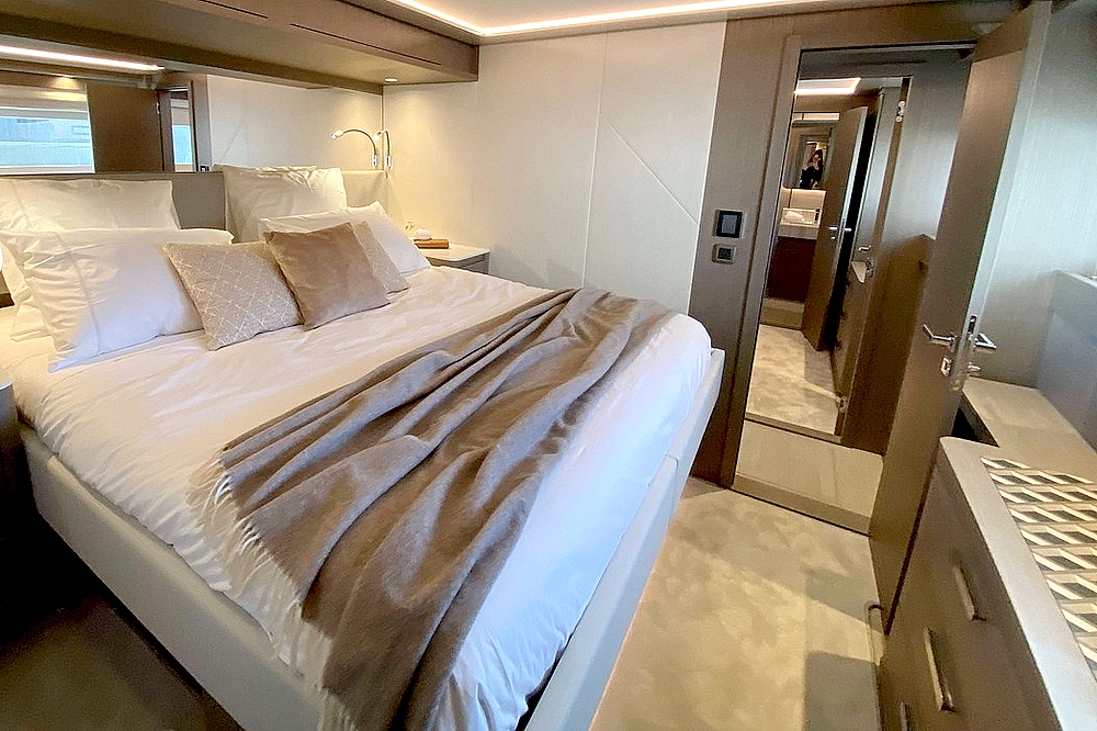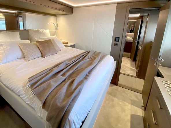 . La suite du propriétaire occupe toute la largeur du bateau à l’avant. Elle est agencée avec un lit King-size en travers,