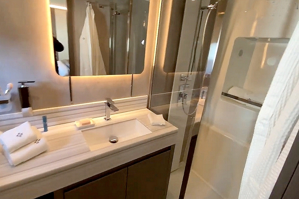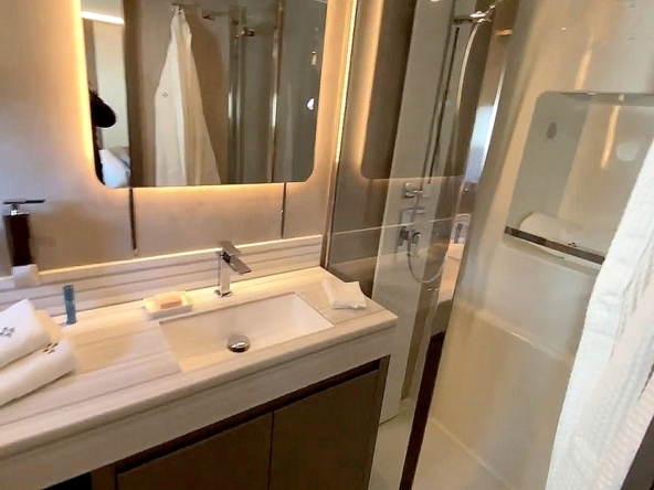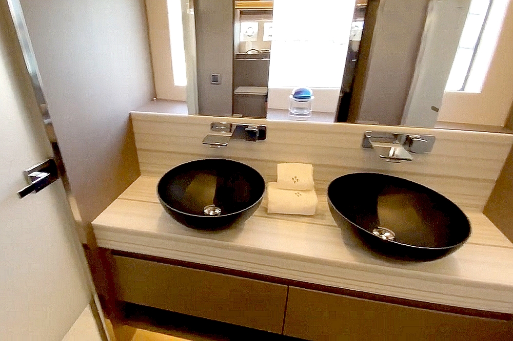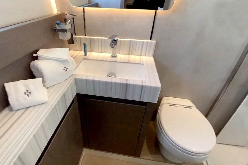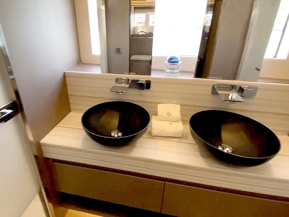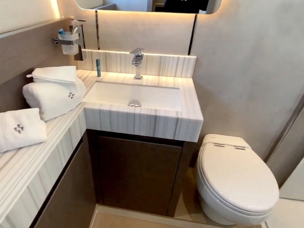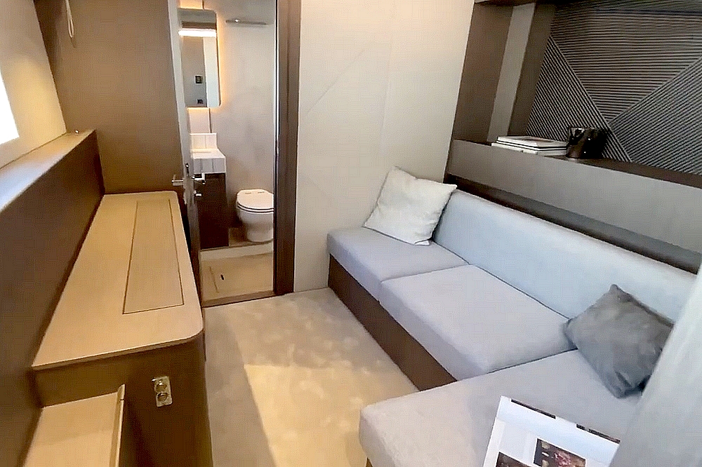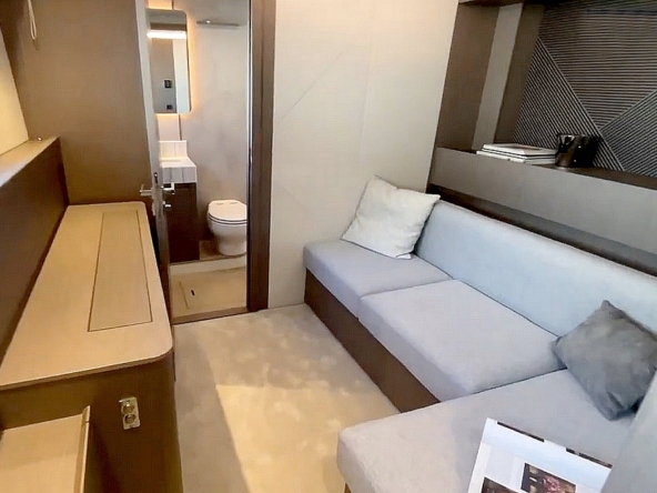 . La cabine VIP est située dans la coque bâbord. Elle est équipée d’un avec lit Queen-size, d’un dressing, d’un petit