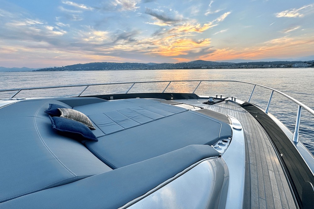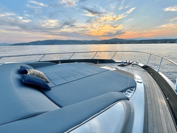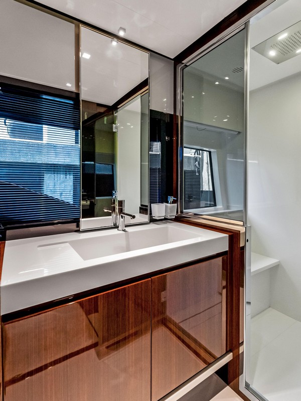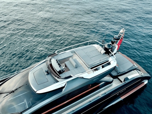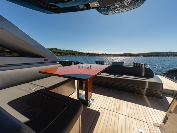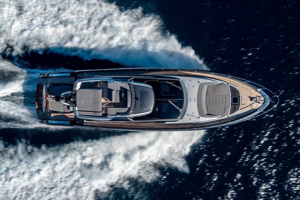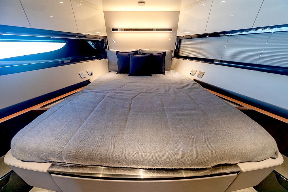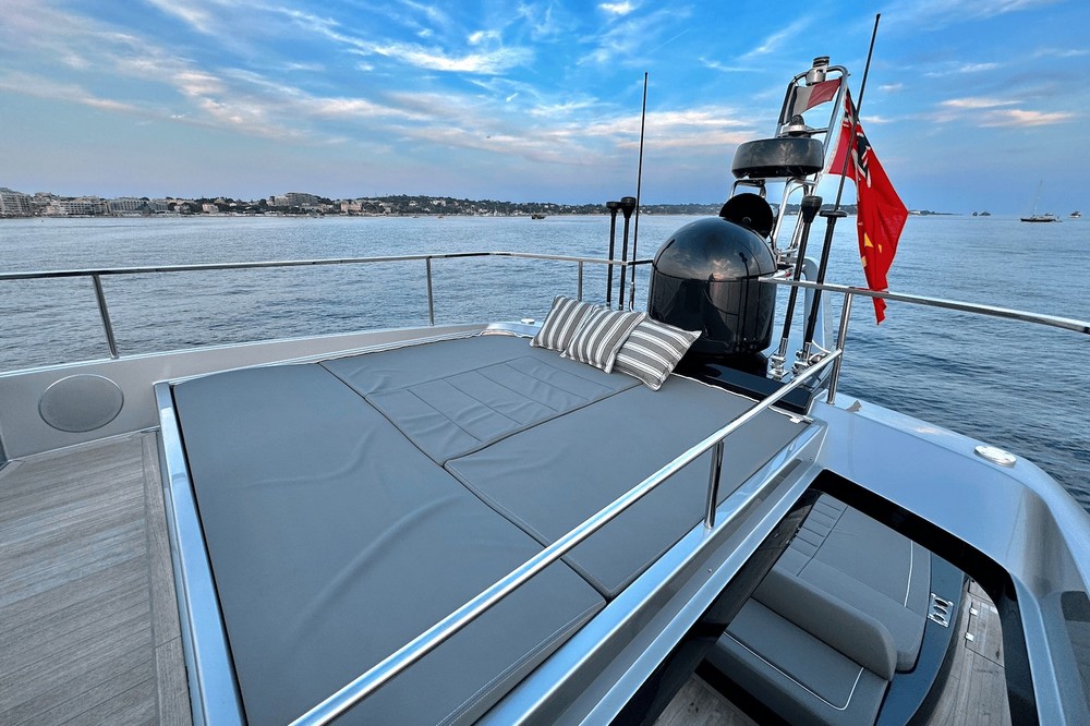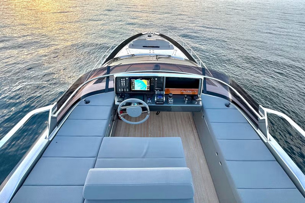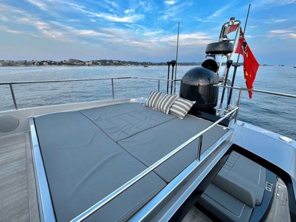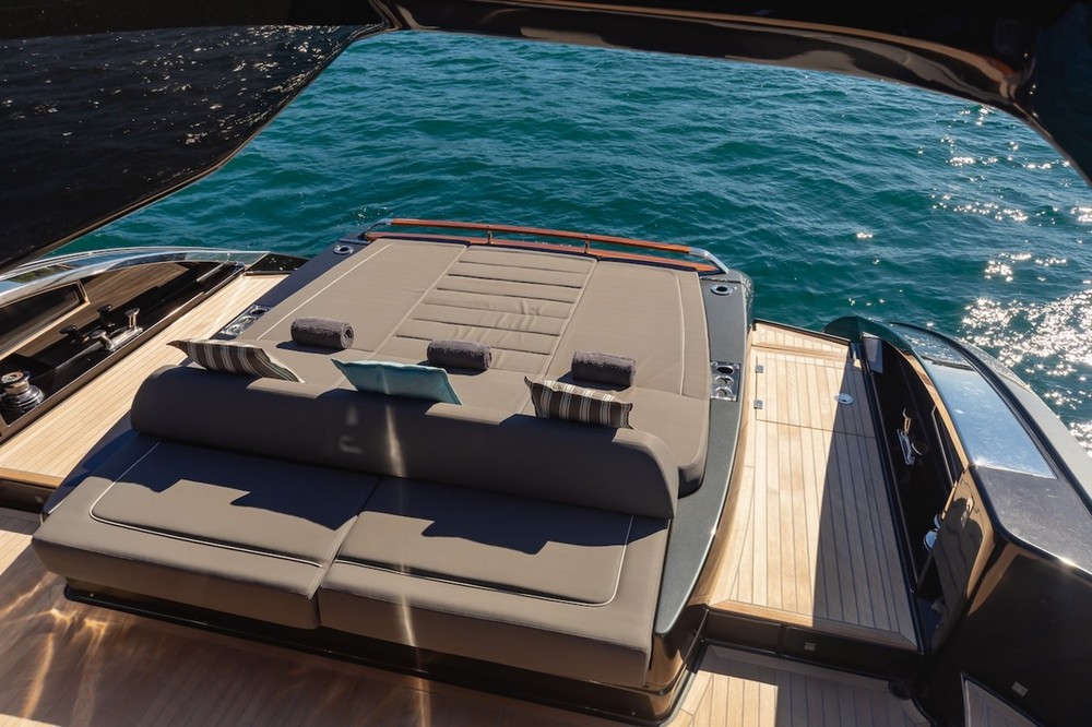 Son flybridge, avec plancher en teck, est agencé d’un bain de soleil arrière sur toute la largeur et de deux bains de soleil de part et d’autre du poste de pilotage central. Il est doté d’un réfrigérateur à tiroirs et d’un bimini repliable.