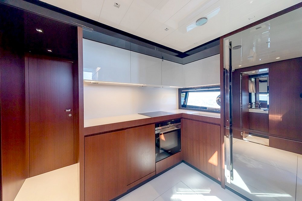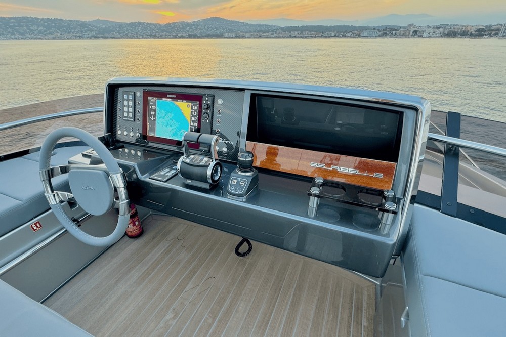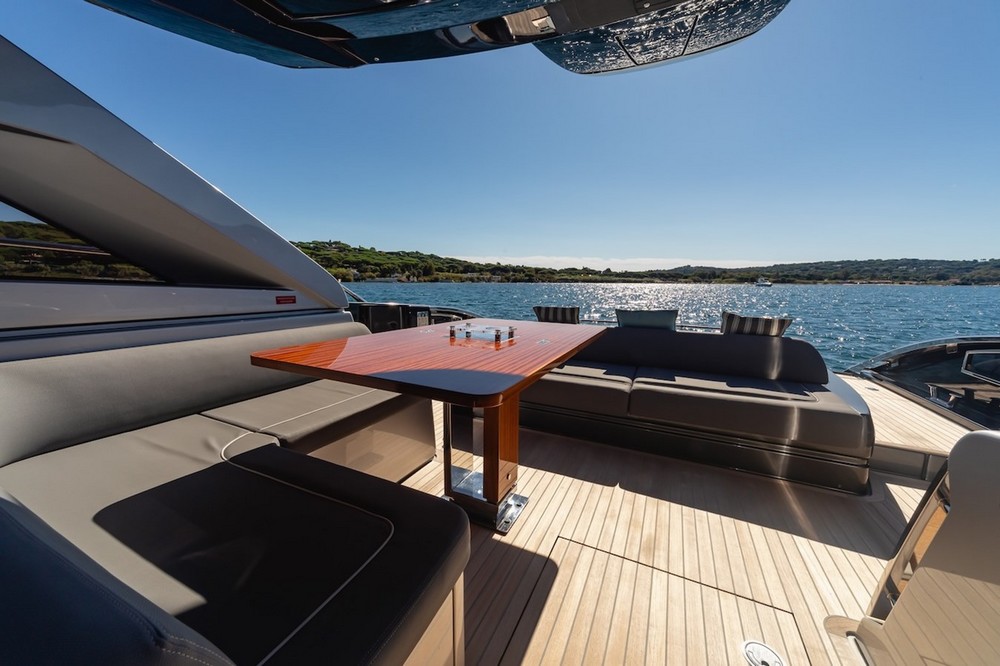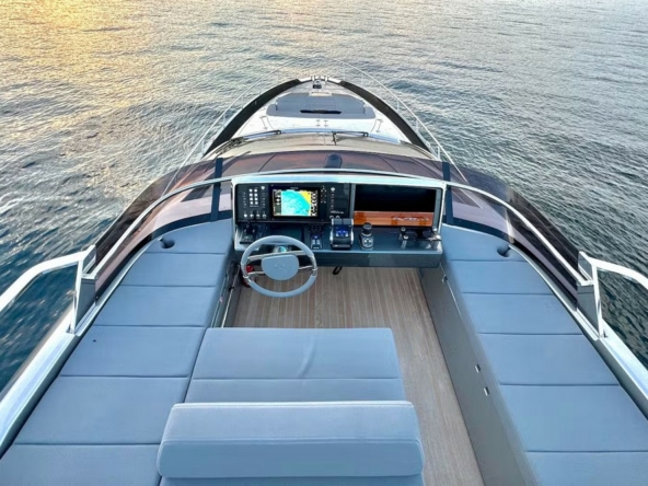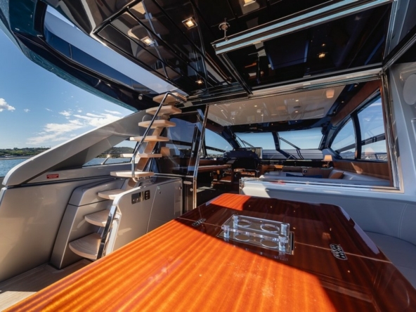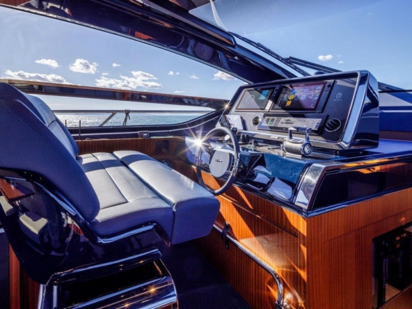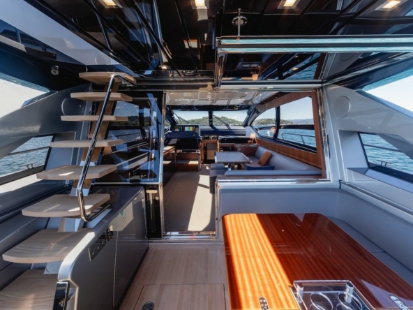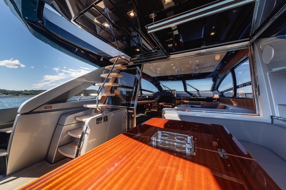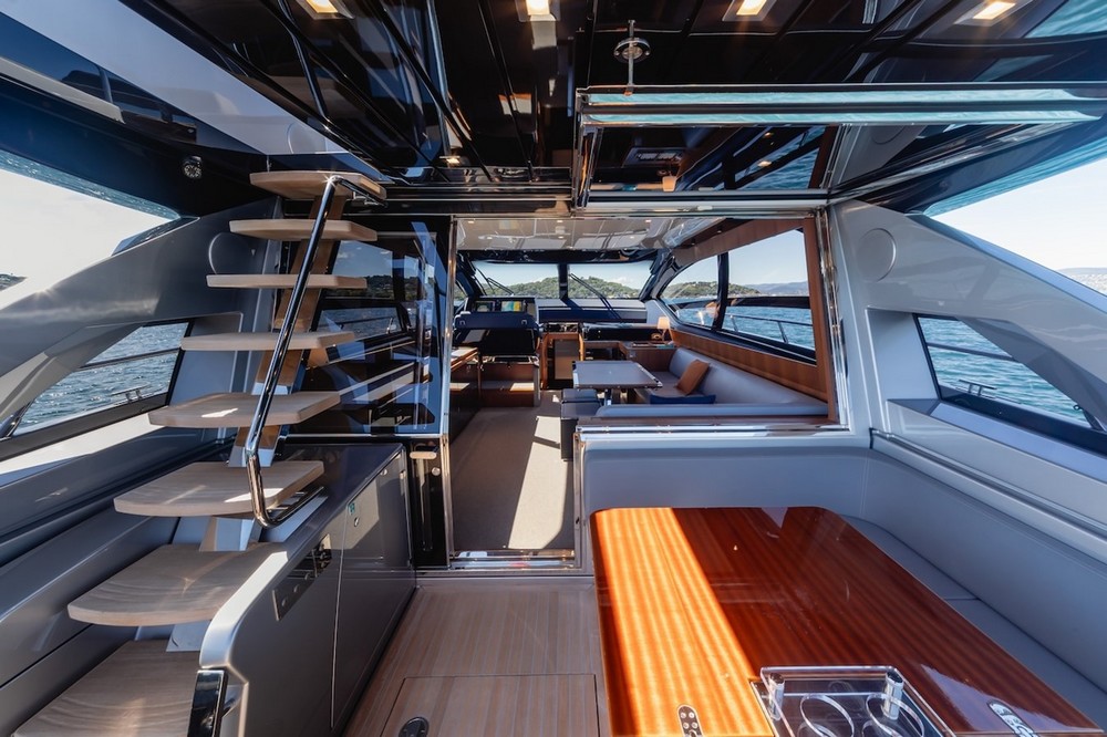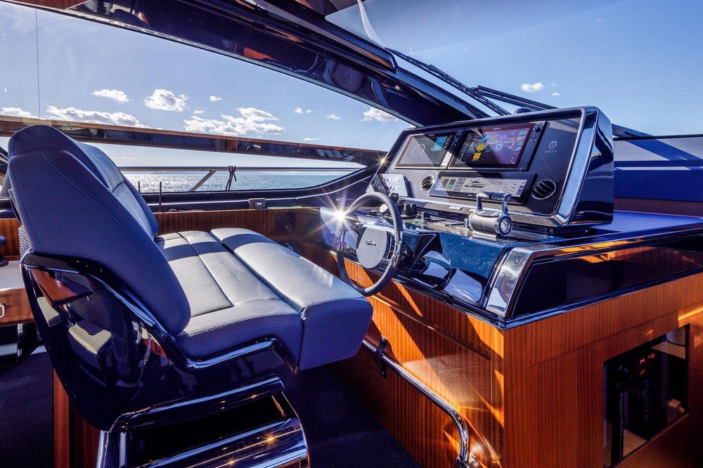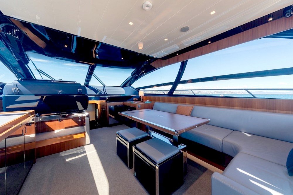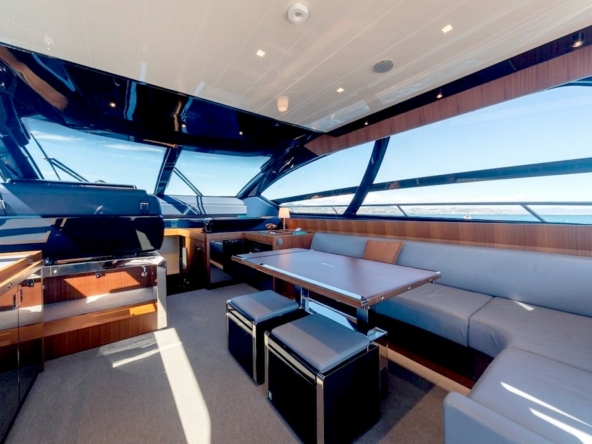 Une baie vitrée donne accès à l’intérieur du pont principal. L’espace est entièrement ouvert et composé du salon/salle à manger sur tribord faisant face au meuble audiovisuel avec téléviseur de 49 pouces escamotable. Le poste de pilotage est à l’avant-bâbord, avec sa belle console à instrument, son volant iconique Riva, et sa banquette de barre biplace. Cette zone est équipée avec un réfrigérateur à tiroirs, des stores vénitiens électriques, et un toit ouvrant électrique sur la partie avant.