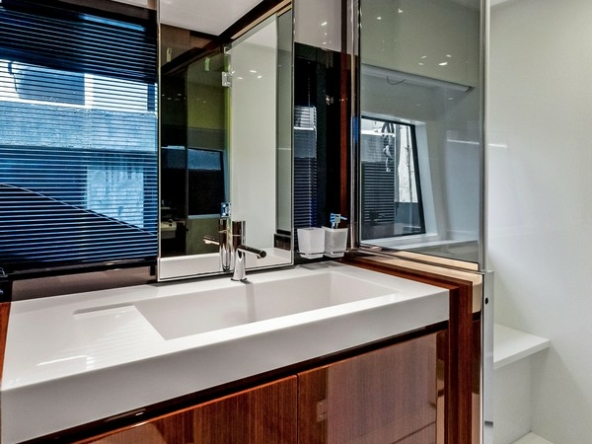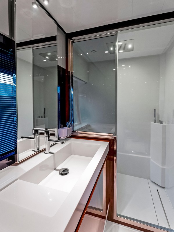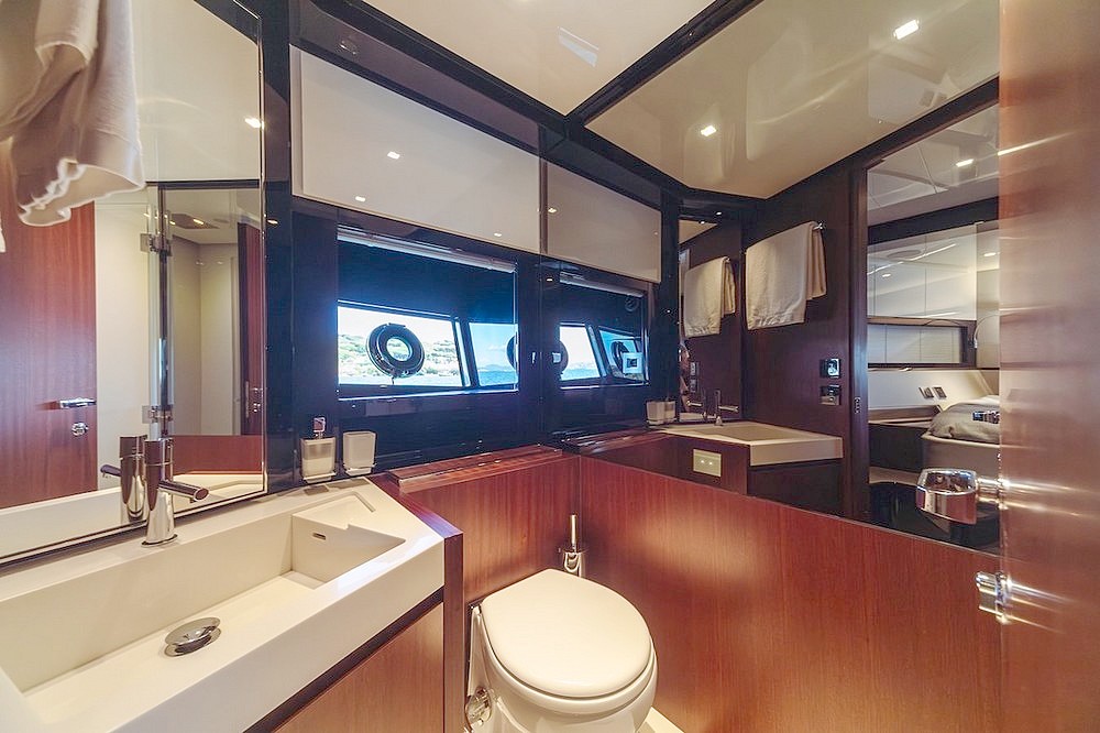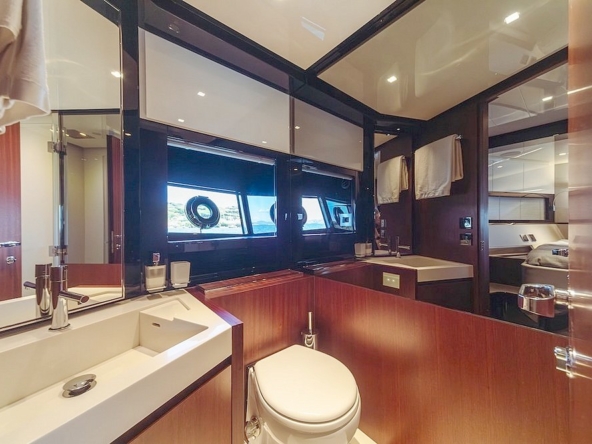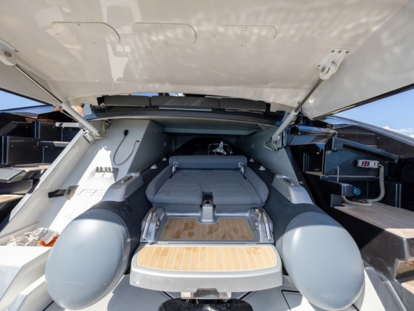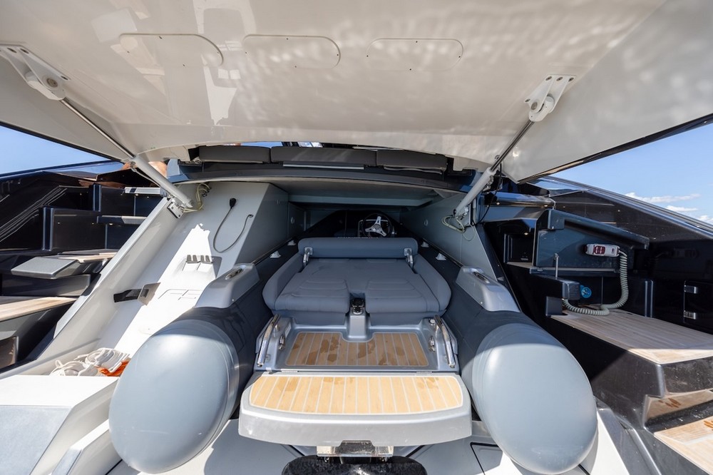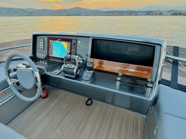 Bateau bien équipe, avec : Système de stabilisation gyroscopique zéro-speed Seakeeper, propulseurs avant et arrière, double système de joystick ‘Yacht Controller’, générateur Onan de 19 kW, système de climatisation tropicale réversible, électronique de navigation Simrad complète, dessalinisateur Idromar de 120 l/h, plateforme de bain hydraulique, garage arrière avec annexe Williams Jat de 3,45 m, etc…