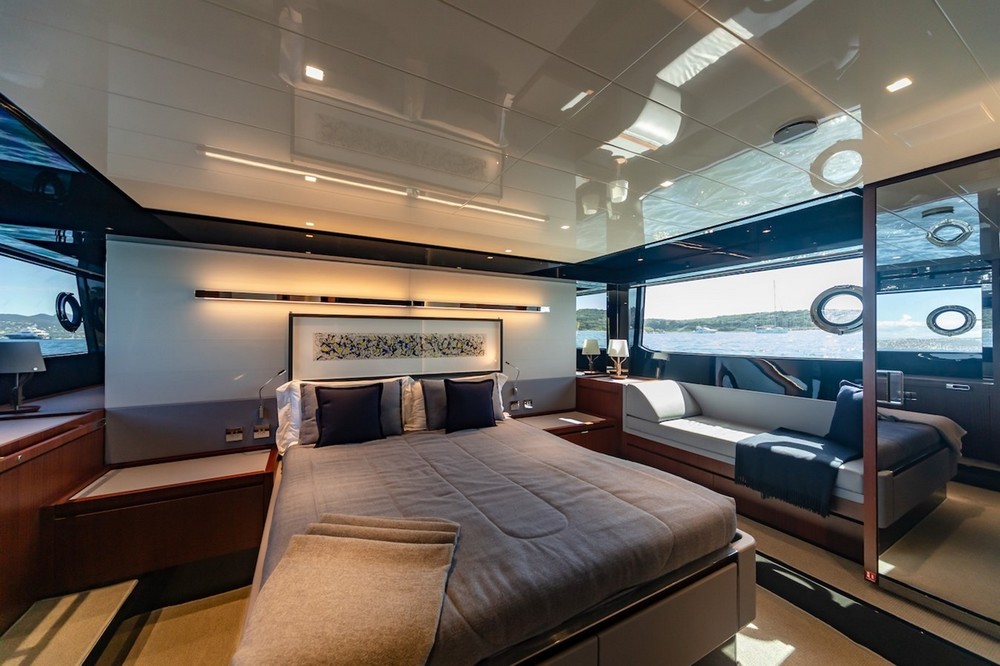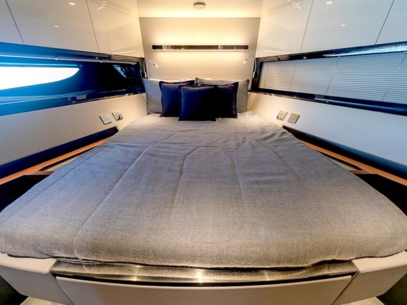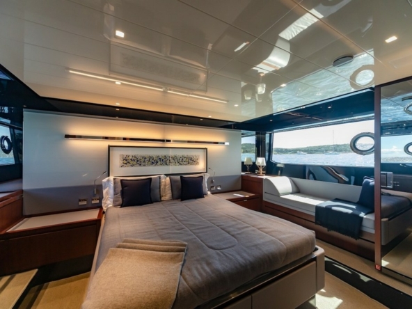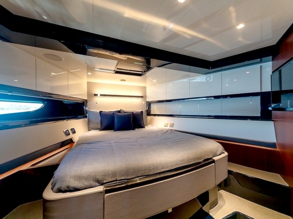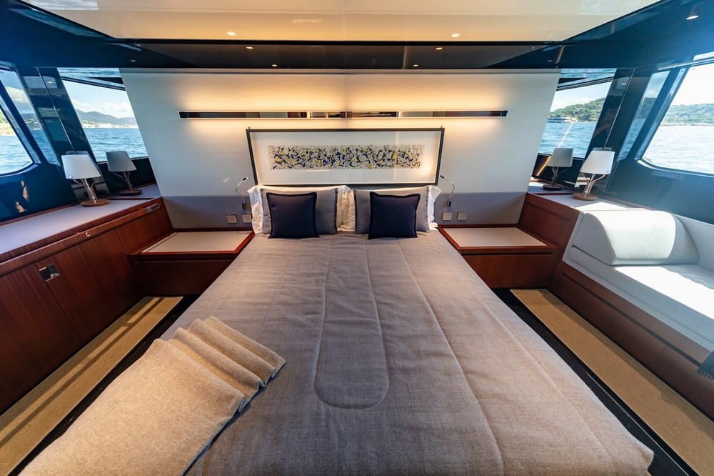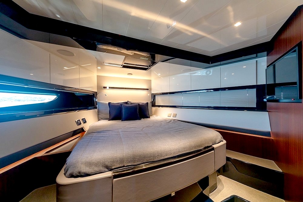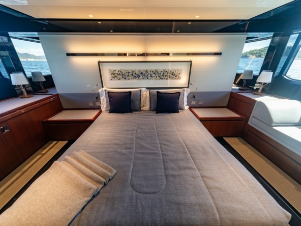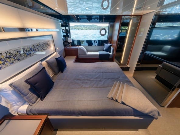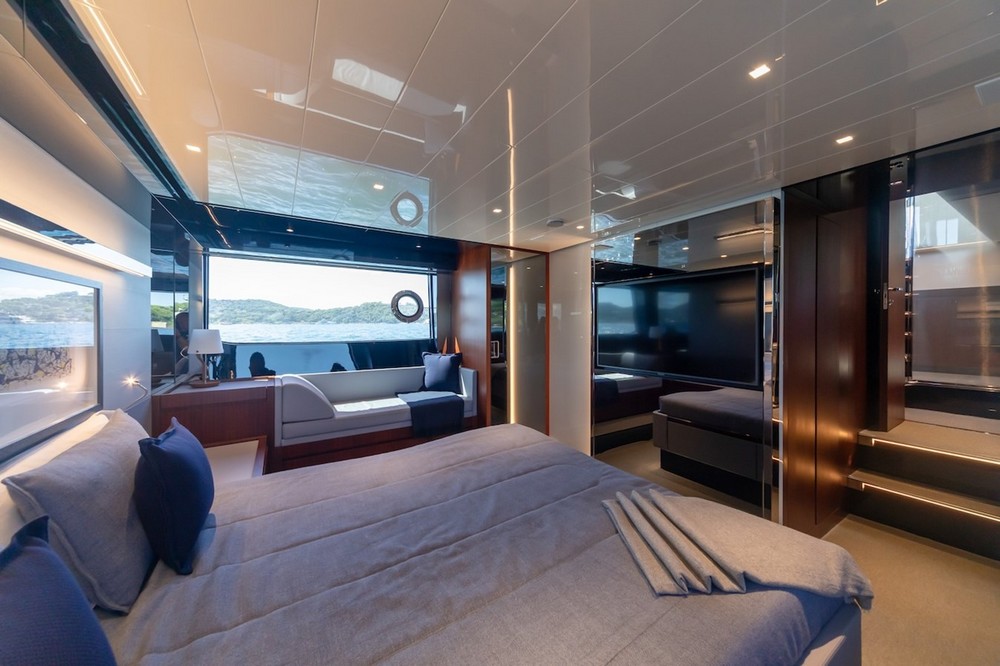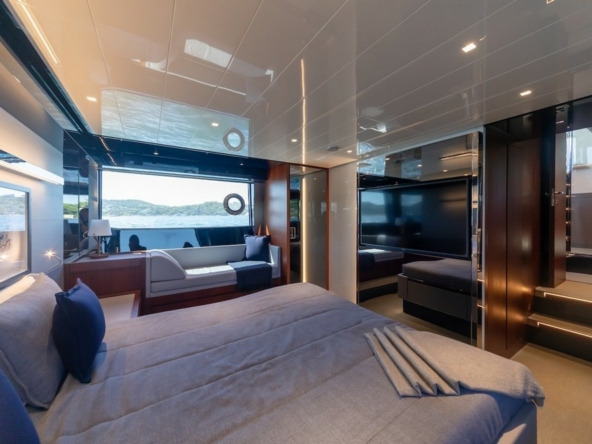 . La suite du propriétaire occupe toute la largeur au milieu du bateau. Elle a un lit king-size face à un téléviseur