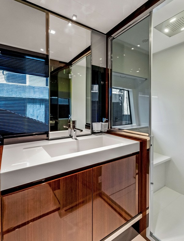 . La cabine double invités est à l’avant, avec un lit queen-size face à un téléviseur 32” avec Apple TV, une