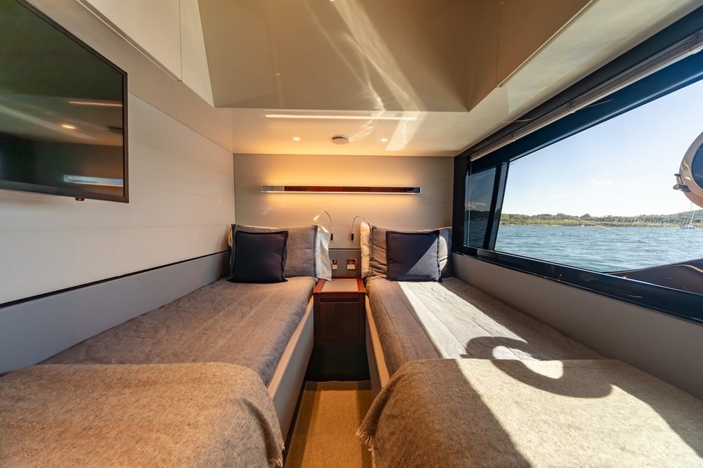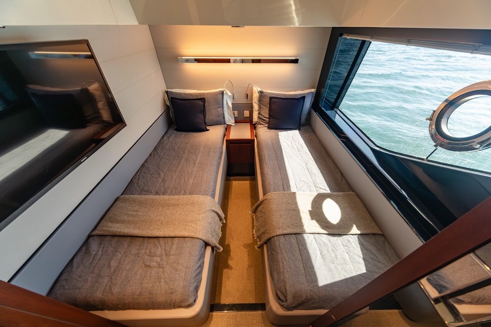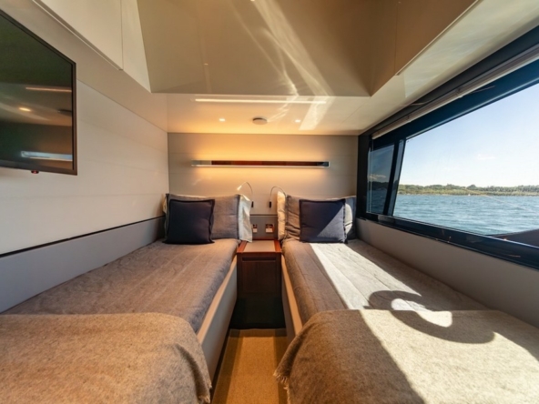 . La cabine twin invités est à bâbord, avec des lits jumeaux face à un téléviseur 32” avec Apple TV, une penderie,