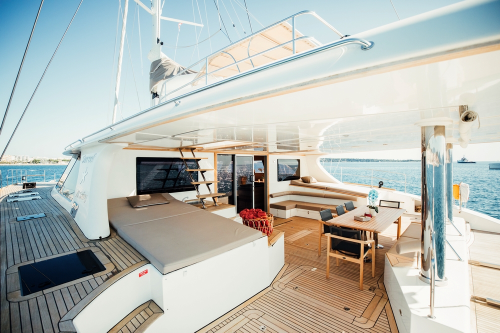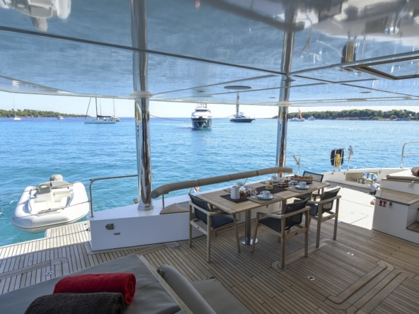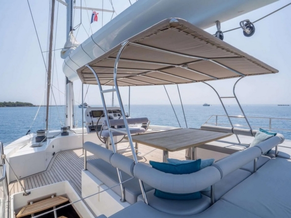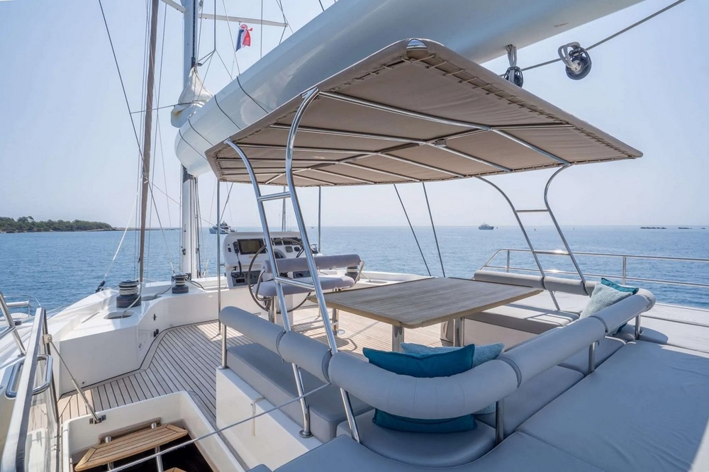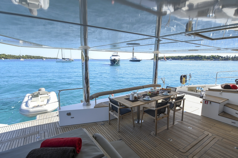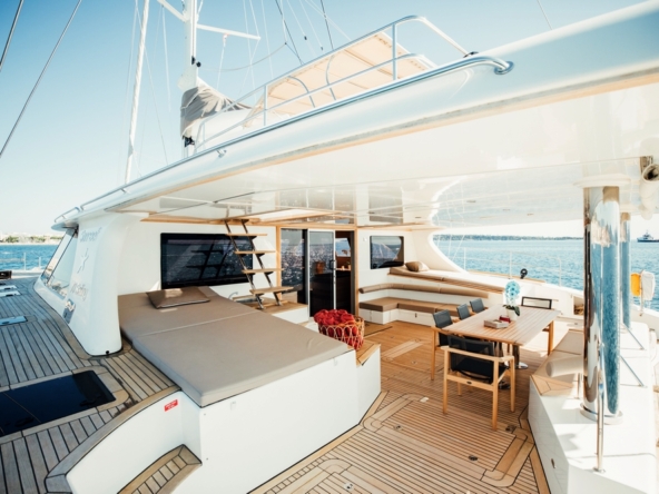Bien abrité par le surplomb du flybridge, le cockpit est vaste. Il est agencé avec deux bains de soleil de part et d’autre, un salon avec canapé en L à tribord, et un meuble bar à bâbord. Une salle à manger occupe l’arrière avec banquette contre la poutre arrière et quatre fauteuils pliants entourant une table en teck. Une plateforme permet de soutenir l’annexe et des escaliers dans les deux jupes arrière amènent à la mer.