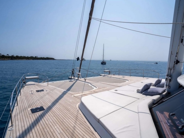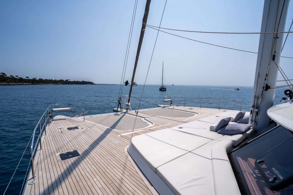 Le pont est également entièrement latté teck avec panneaux flush-deck et a deux trampolines sur l’avant.