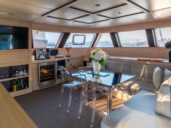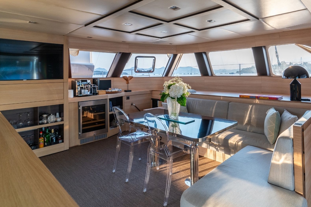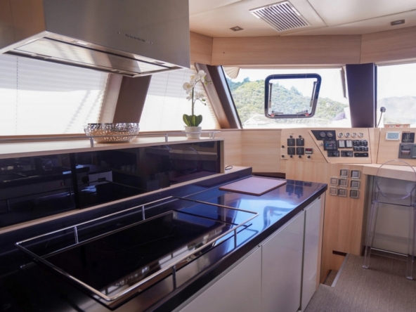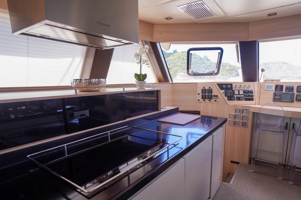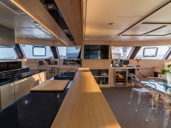 A bâbord, la vaste cuisine est entièrement équipée avec évier double bac, compacteur de déchets, plaque électrique quatre feux et hotte aspirante, four électrique, four microondes, lave-vaisselle, réfrigérateur de 350 litres, congélateur de 240 litres, machine à glaçons, et cave à vin de 32 bouteilles. Un bar sépare la cuisine de la zone salon/salle à manger. Celle-ci a une banquette en L et des chaise transparentes entourant une table sur pieds réglables. L’avant comprend le poste de pilotage, la télévision et beaucoup de rangements.