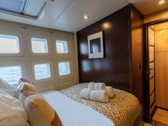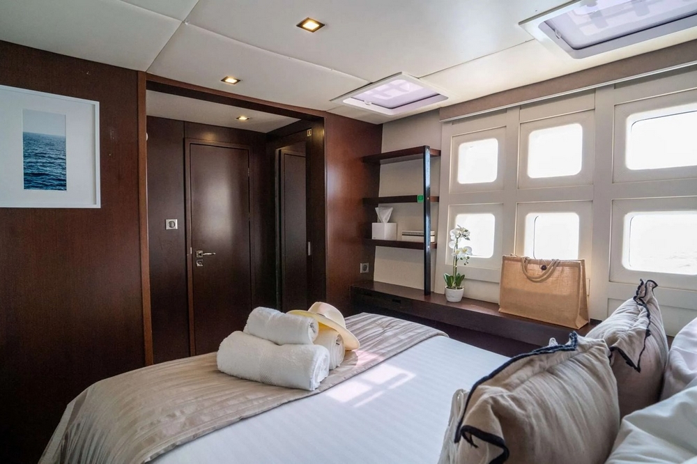 Il peut accueillir 8 invités dans 4 cabines et 3 membres d’équipage dans 2 cabines.