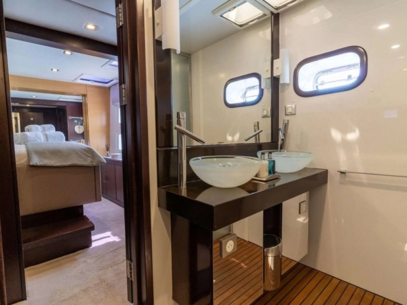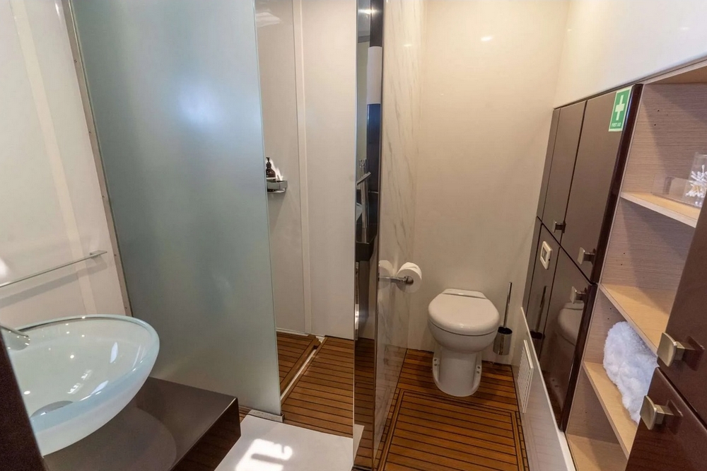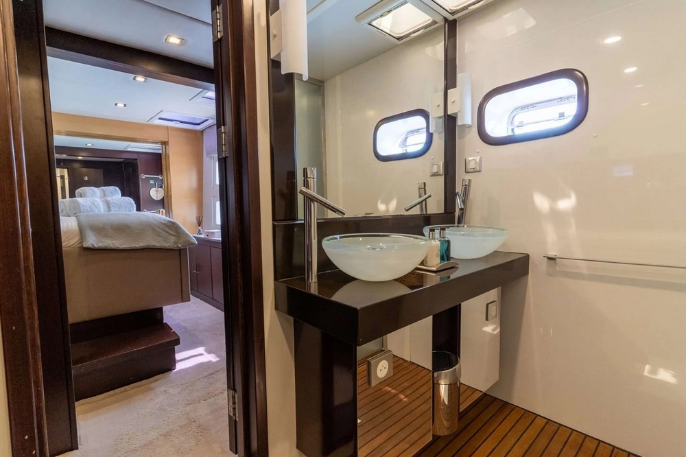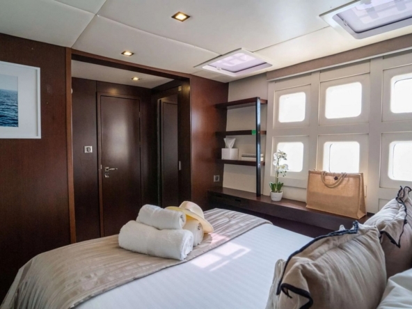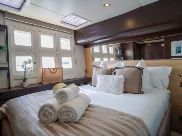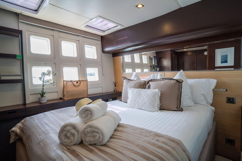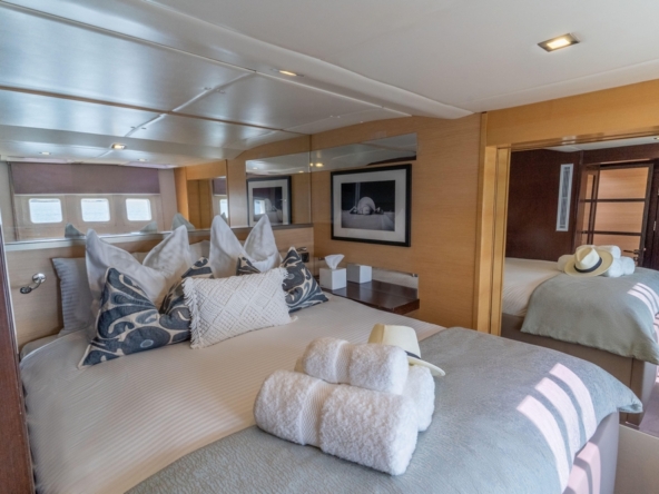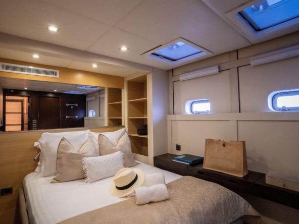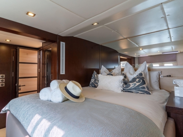 . La spacieuse cabine du propriétaire, située à l’avant de la coque tribord, comprend un lit king-size, une coiffeuse, des