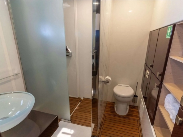 . Une deuxième cabine invités avec lit queen-size et salle de bain est au milieu de la coque-bâbord.
