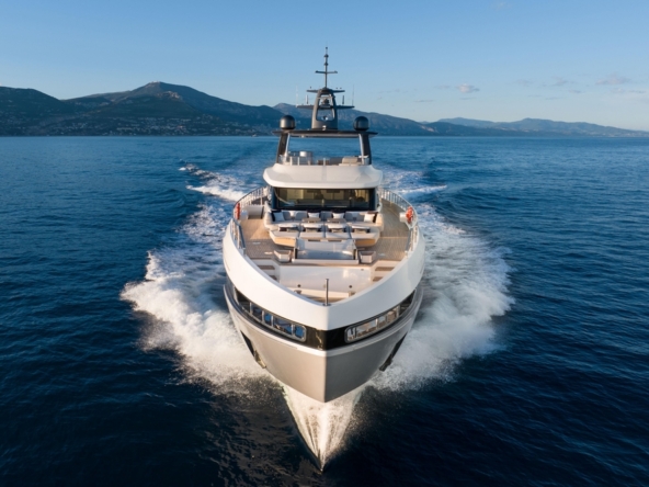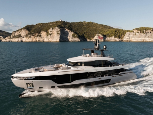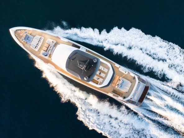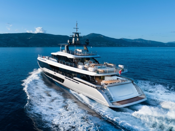 A cutting-edge yacht embodying the pinnacle of Italian craftsmanship. Instantly recognizable with her sleek and elegant lines designed by Alberto Mancini, this three-deck vessel, with her metallic gray hull, boasts a modern and sporty look. Built by Azimut Yachts shipyard with a D2P (Displacement to Planing®) GRP hull and carbon fiber superstructures, she offers an exceptional strength-to-weight ratio. The bulbous bow enhances wave-cutting performance and the overall efficiency of this spacious and luxurious superyacht.
