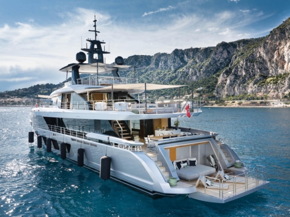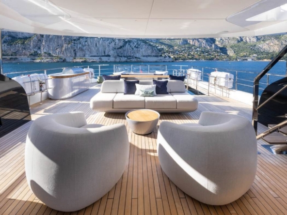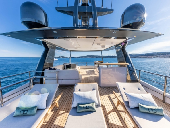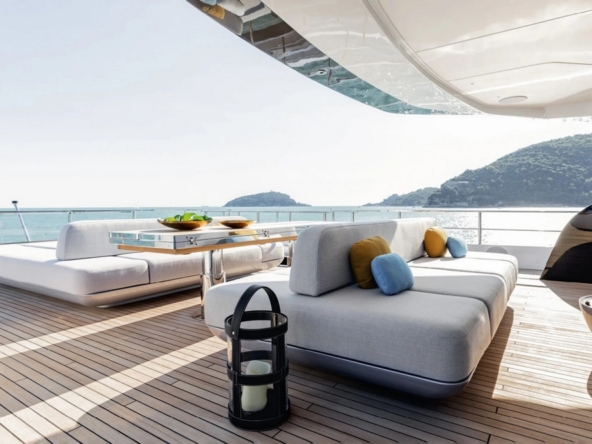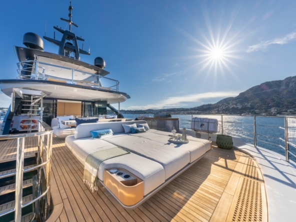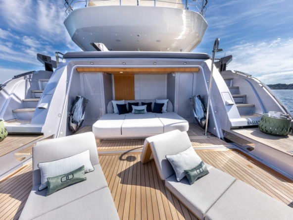 Two staircases on either side of the transom provide access to the swimming platform. This one can be significantly extended by tilting the transom, revealing a magnificent beach club with a large sunbathing and two folding sun loungers.