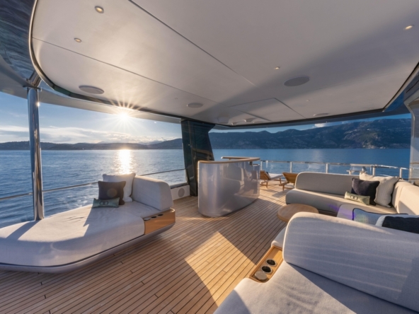 Three sun loungers are positioned aft on the teak-slatted sun deck. Sheltered beneath the magnificent black hardtop, a lounge with a U-shaped sofa and coffee table faces a bar, and two sunbathing are located forward.