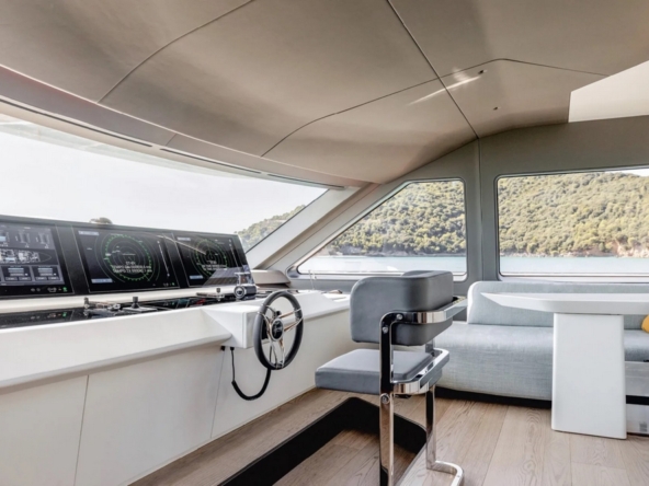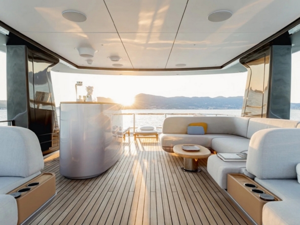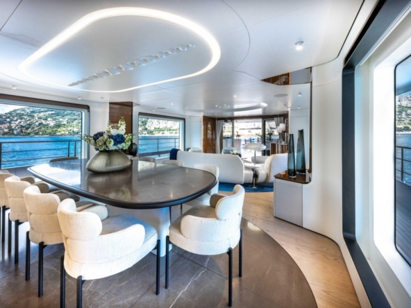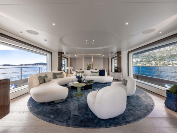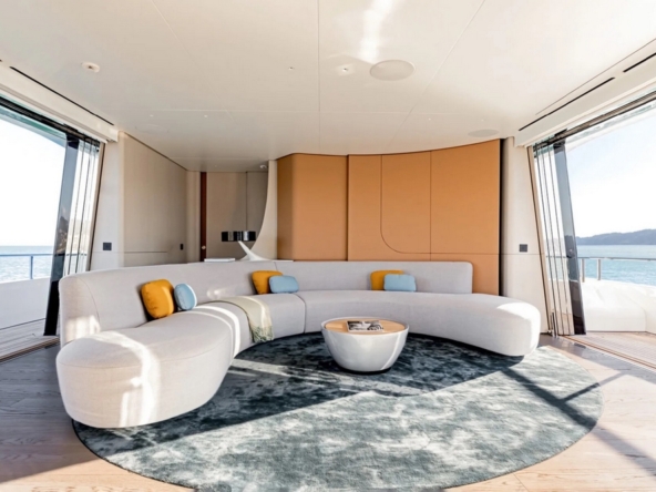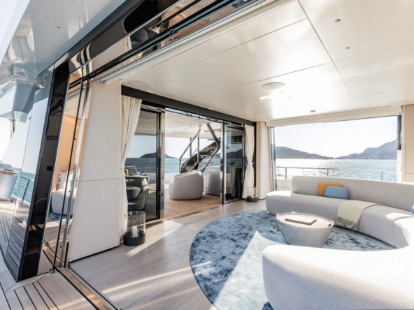A lounge, furnished with semicircular sofas in front of a coffee table, benefits from two electric sliding glass doors to the sides, veritable gateways to the sea, and a third electric sliding glass door aft, leading to the terrace.