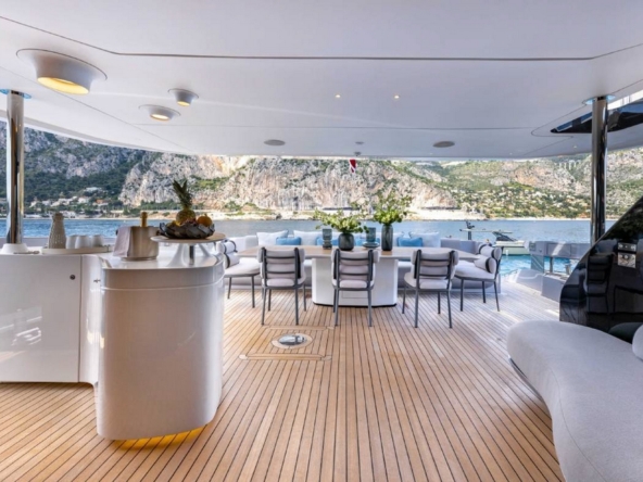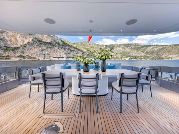 On the aft deck, the cockpit is furnished as a spacious dining area, with an impressive table surrounded by a full-width bench seat and five stylish designer chairs, complemented by a bar and a sofa.
