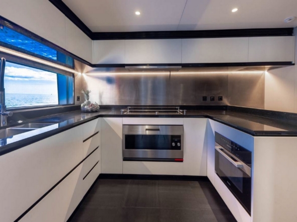 Advanced, to port, is the large, modern, and fully equipped white galley. To starboard, the passageway leading to the owner's suite includes the staircase to the lower and upper decks, as well as a day toilet.