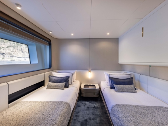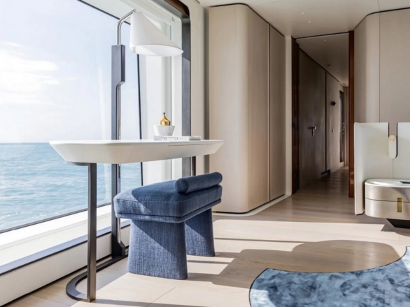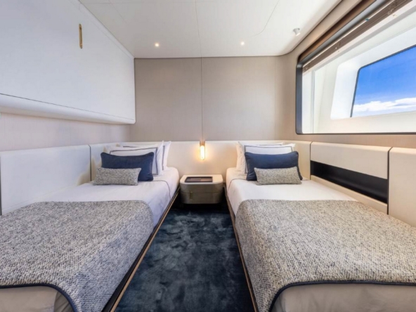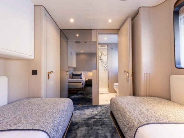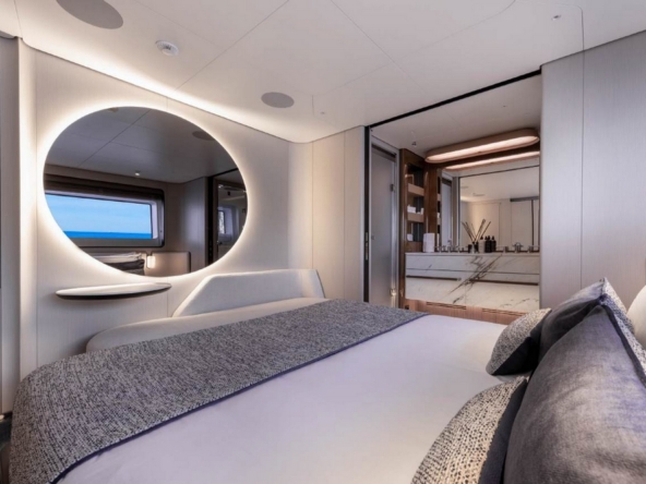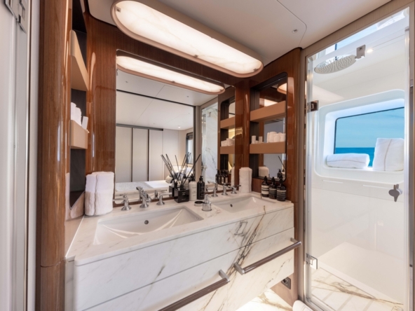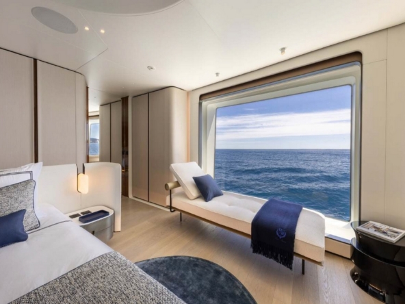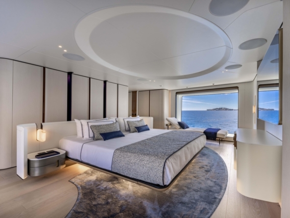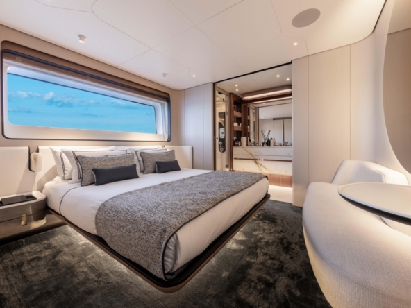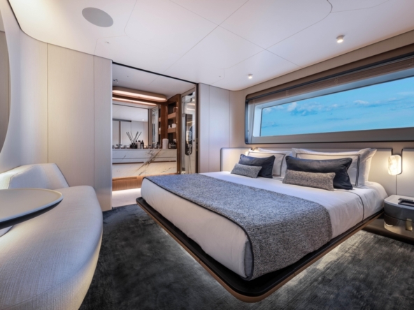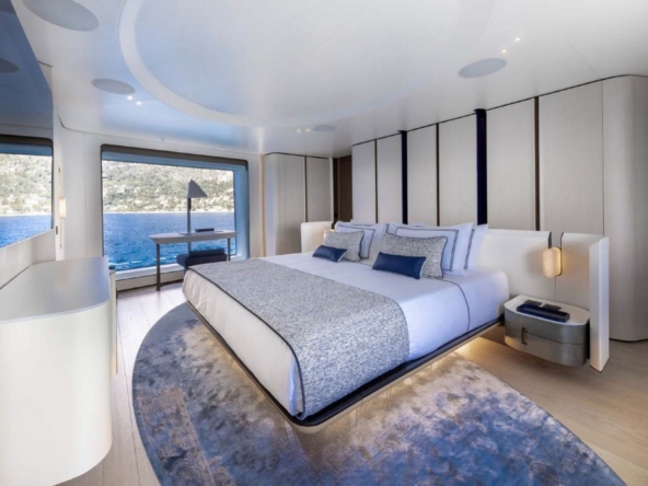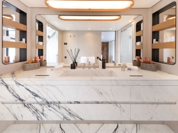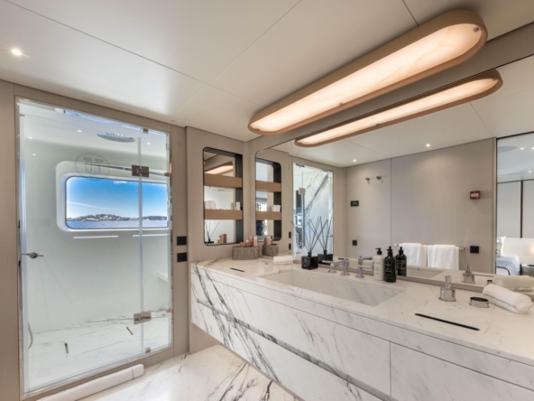This master stateroom is immense, with floor-to-ceiling windows offering breathtaking sea views. It spans the entire beam and is furnished with a king-size bed, a sofa/sun lounger, a desk, a dressing room, and a beautiful white marble bathroom.