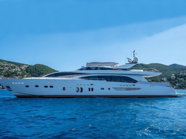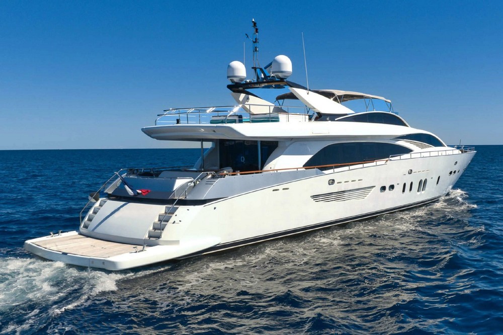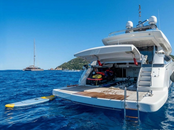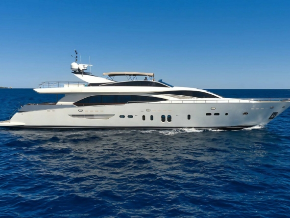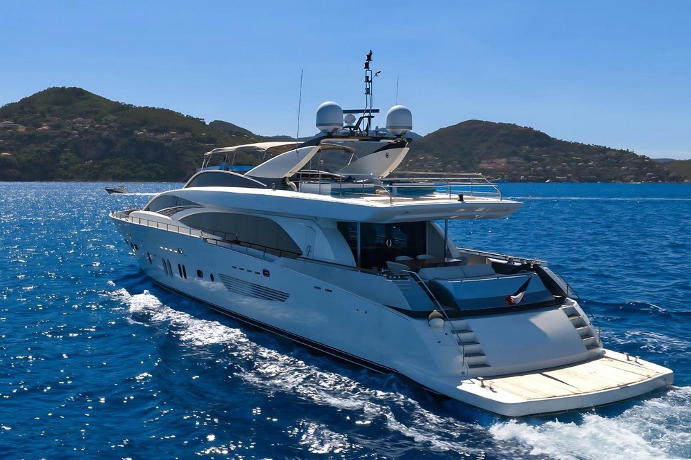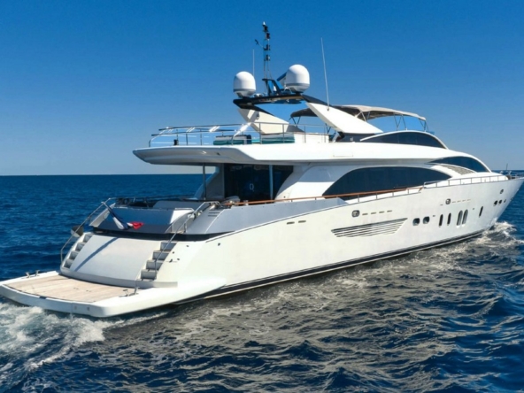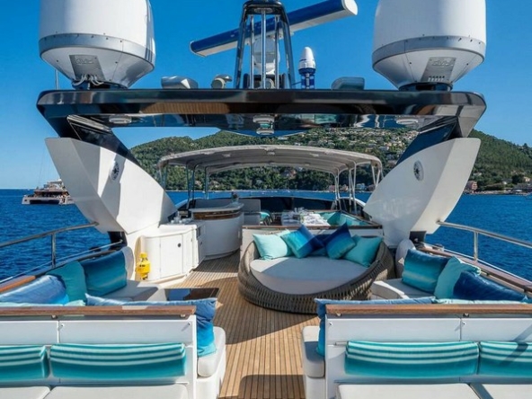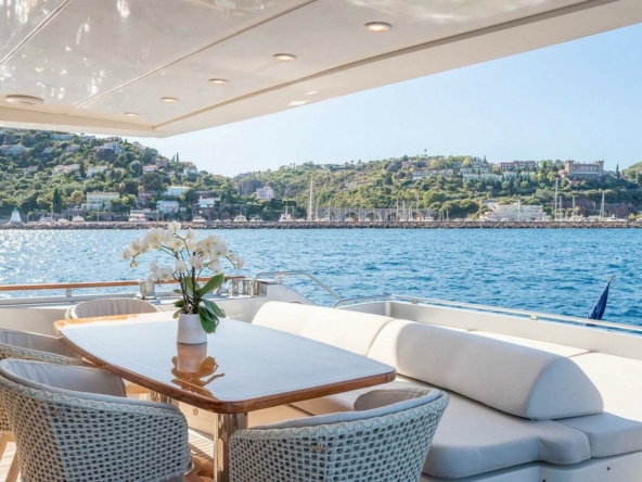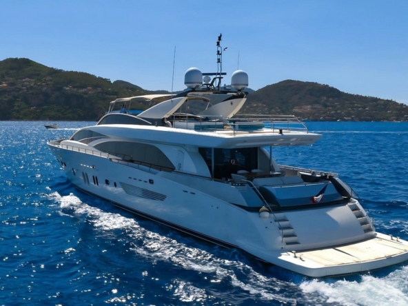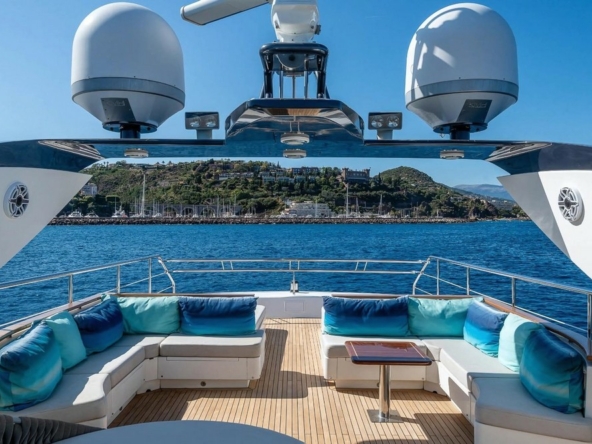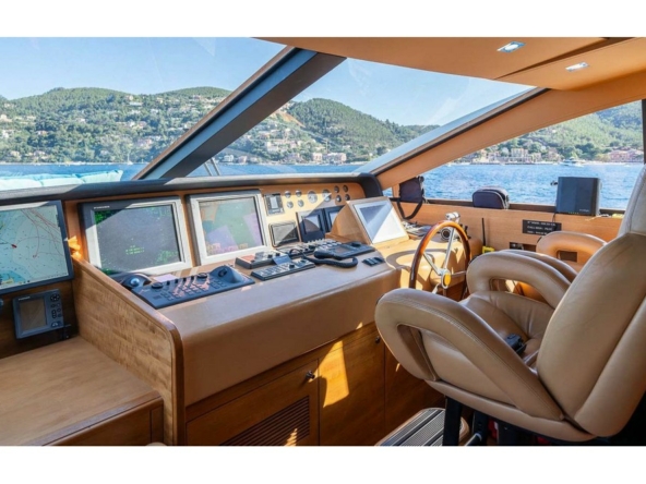 Boat very well equipped, features: SK35 zero-speed gyroscopic stabilization system, bow thruster, 2 x 55 kW Kohler generators, Condaria reverse cycle air conditioning, 180 l/h watermaker, complete Furuno and Simrad navigation electronics, Felcom18 and Inmarsat C satellite communications, swimming platform, aft garage including a 4.70 m Zodiac tender with 80 hp engine and a Sea-Doo jet ski. Water toys (carbon fiber paddleboard, wakeboard, donuts, banana, water skis, fishing gear), etc…