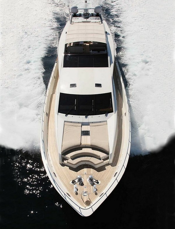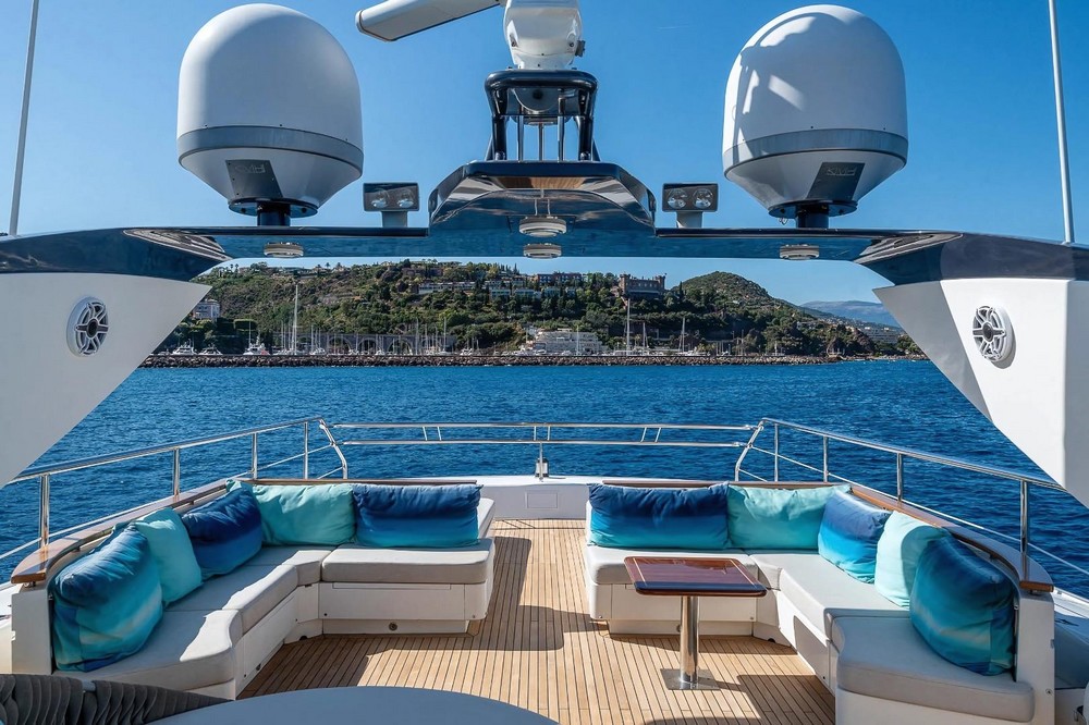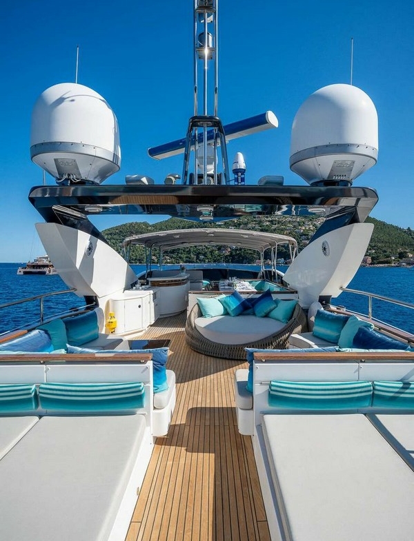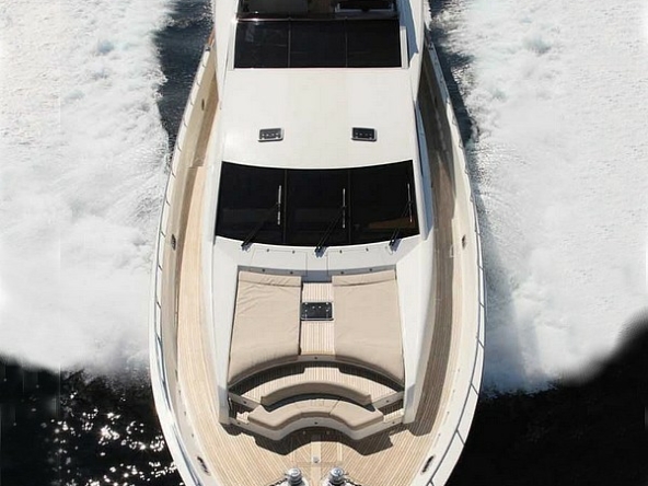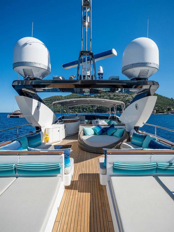The foredeck is furnished with two sunbathing and a curved settee facing forward.