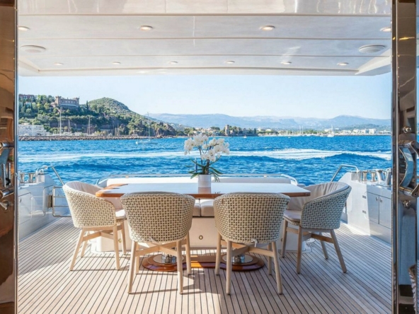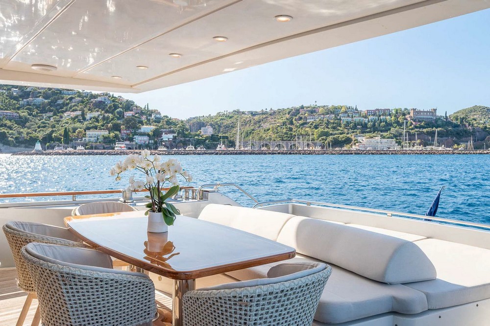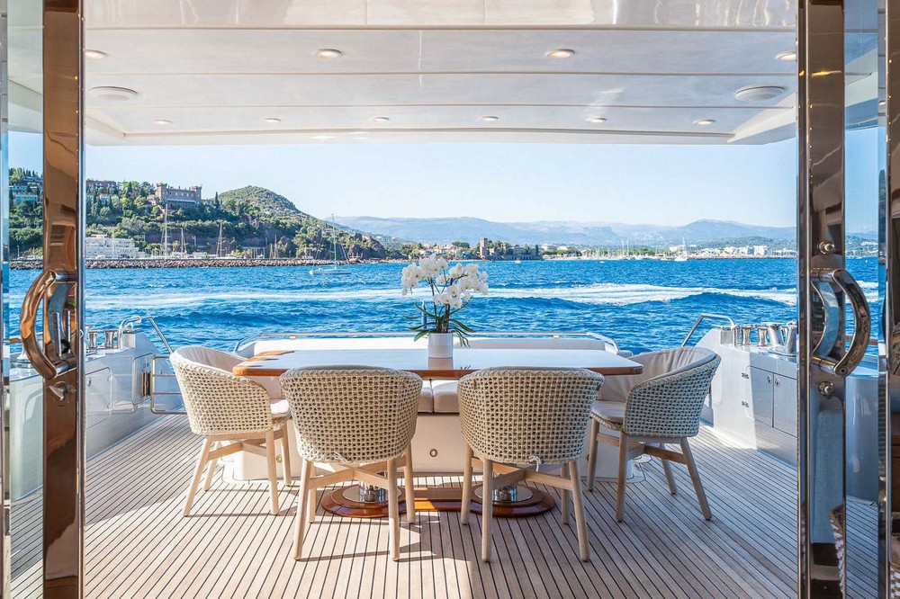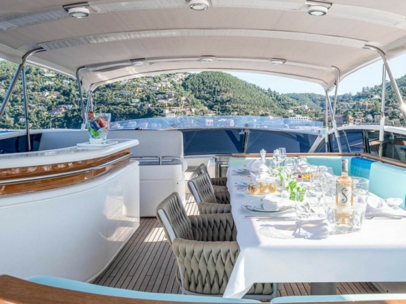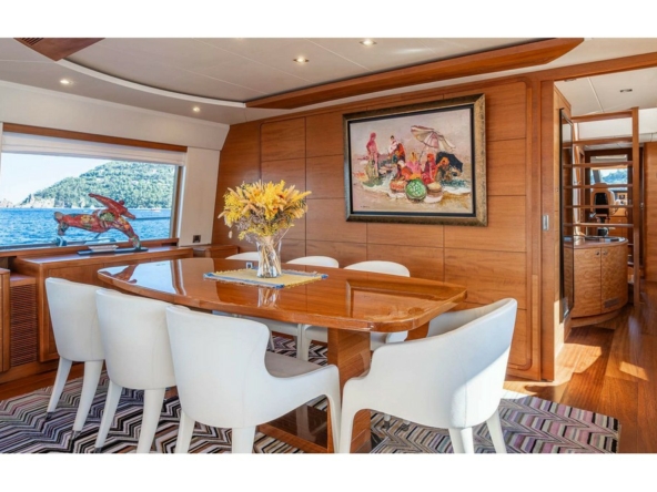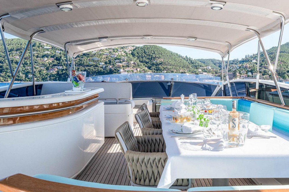 Another full-beam sunbathing occupies the aft section, and the cockpit, sheltered by the flybridge overhang, is configured as a second outdoor dining area with a bench seat and four armchairs surrounding a varnished teak table.
