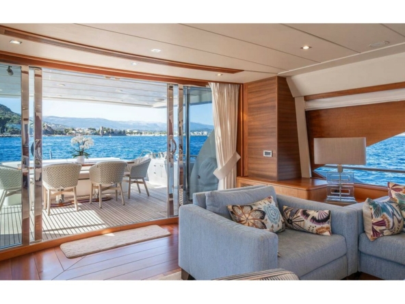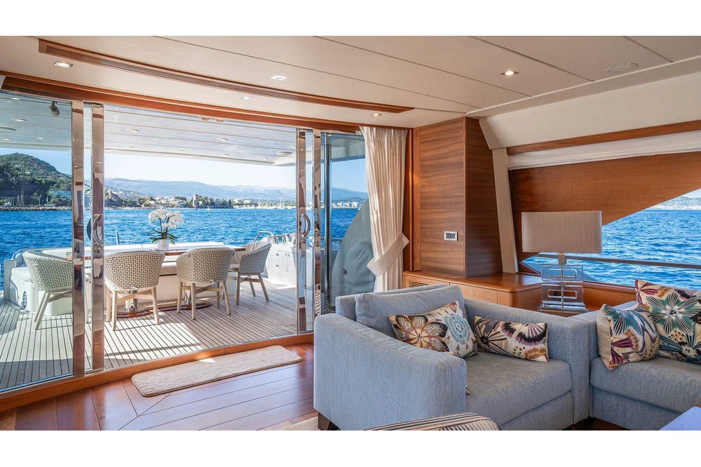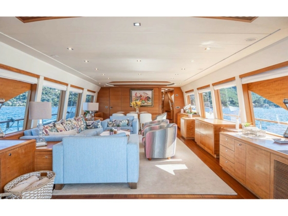 A large sliding glass door provides access to the interior of the main deck. The space, designed by Franck Reynaud, is classically styled with beautiful woodwork bathed in light thanks to the eight side windows.