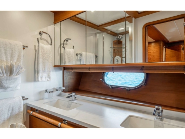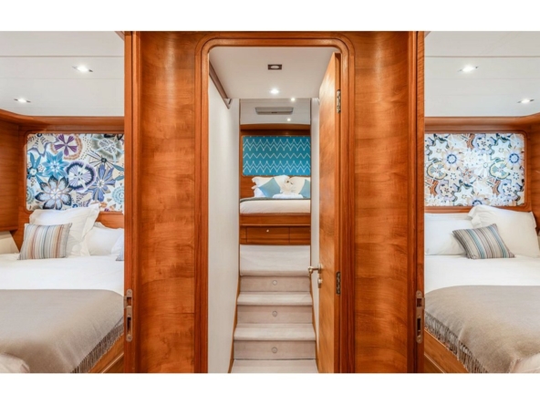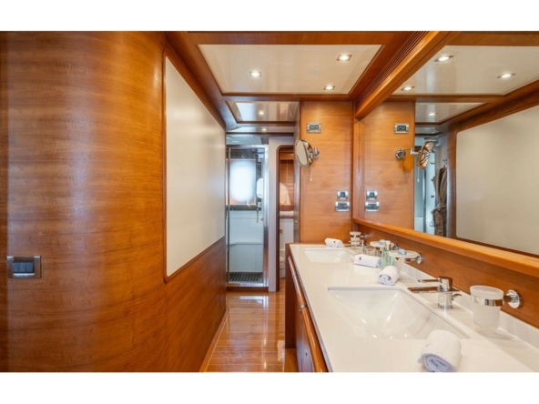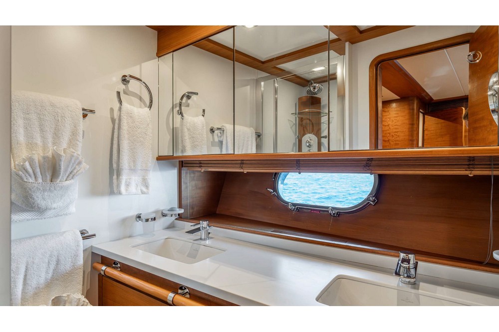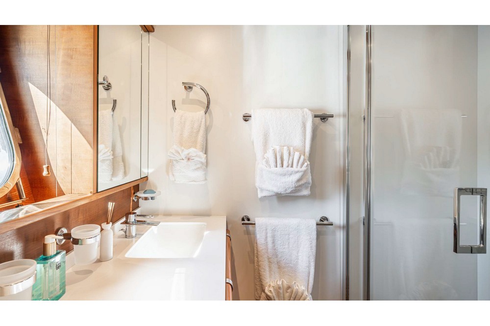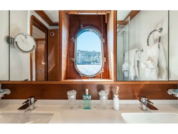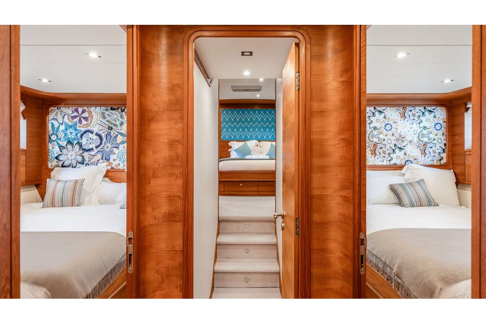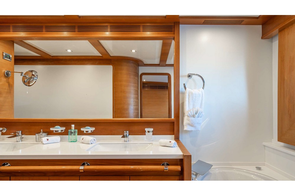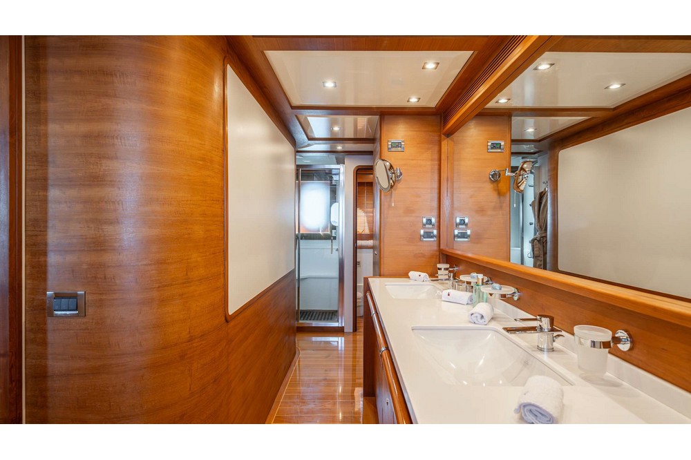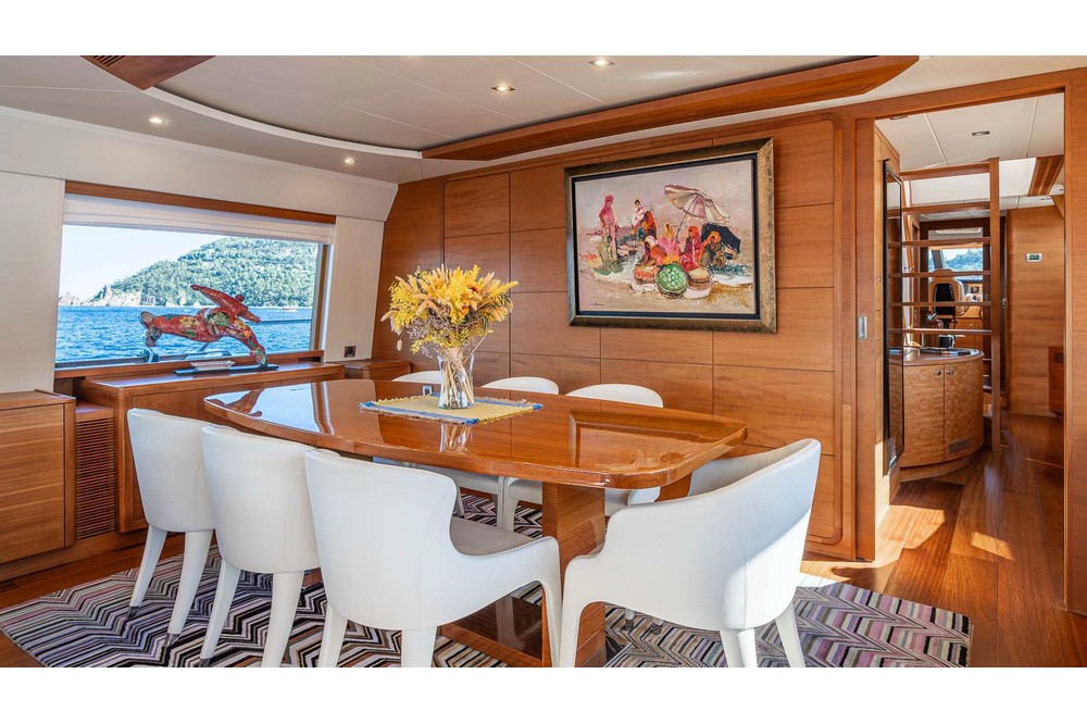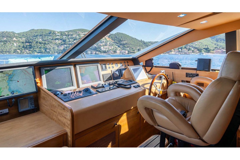 The spacious saloon features three U-shaped sofas and two armchairs around the coffee table and faces the media unit with a 42-inch retractable television. Forward, the dining room, seating eight, is positioned abeam. The fully equipped galley includes a double sink, Miele induction hob, Miele extractor hood, Miele electric oven, Bosch microwave, Miele dishwasher, refrigerator, freezer, and icemaker. It includes the crew mess with a watertight door opening onto the port side deck, and a staircase providing direct access to the crew cabins. A day head is in the passageway leading from the dining room to the wheelhouse. This one is spacious and equipped with the instrument console, the steering wheel, and two comfortable helm chairs to starboard. The chart table is amidships and a dinette is to port.