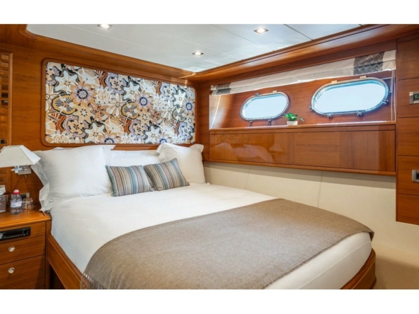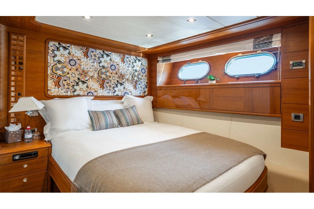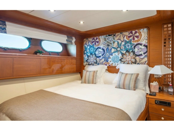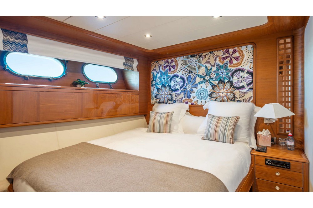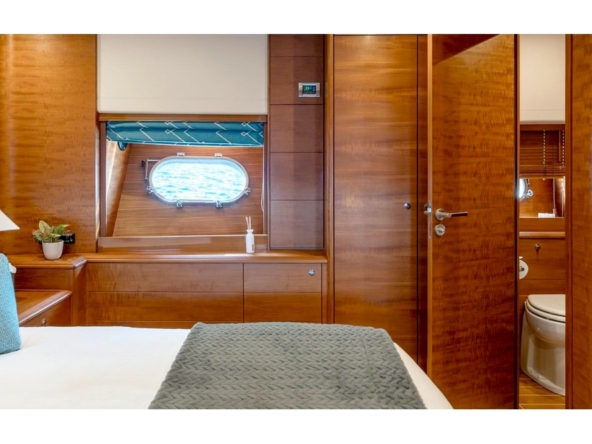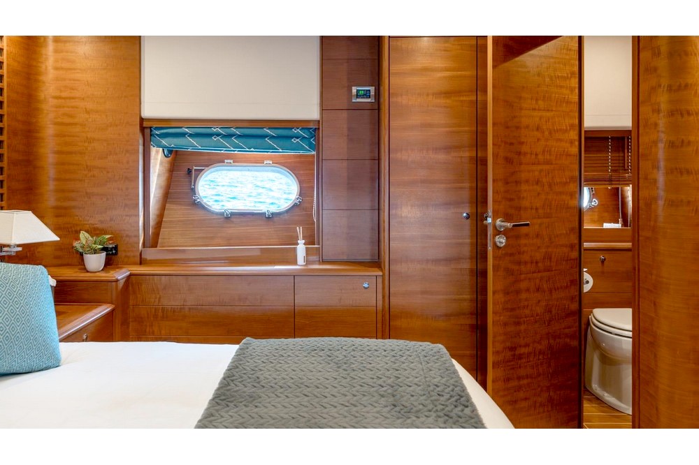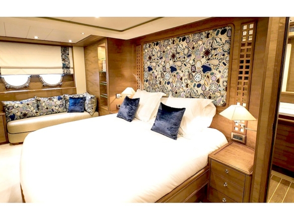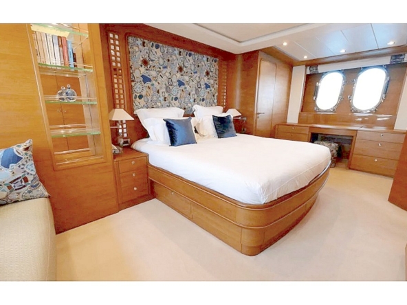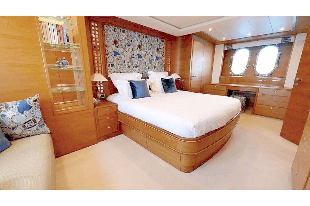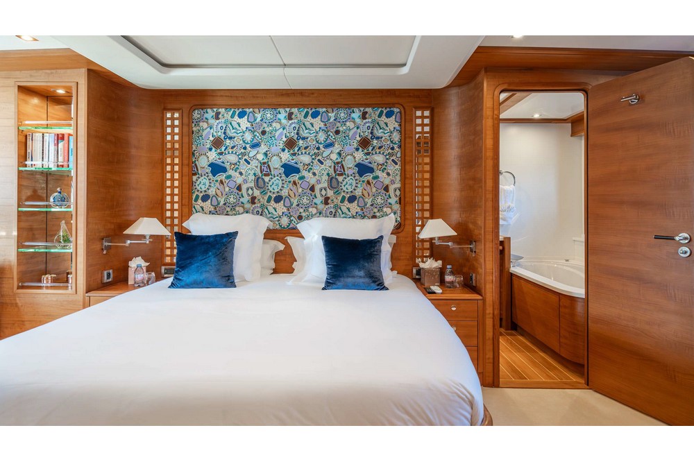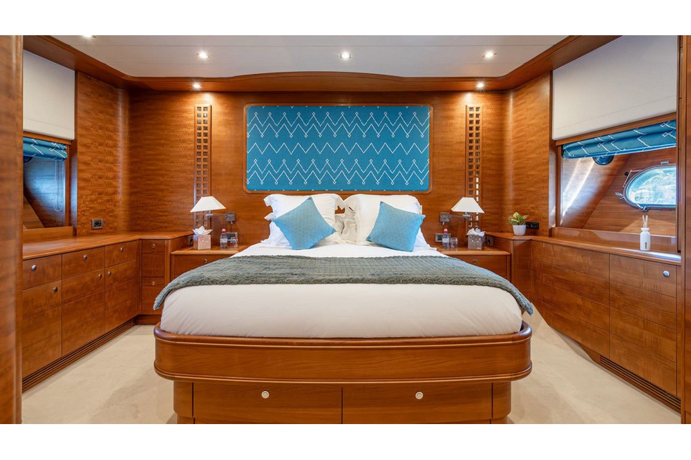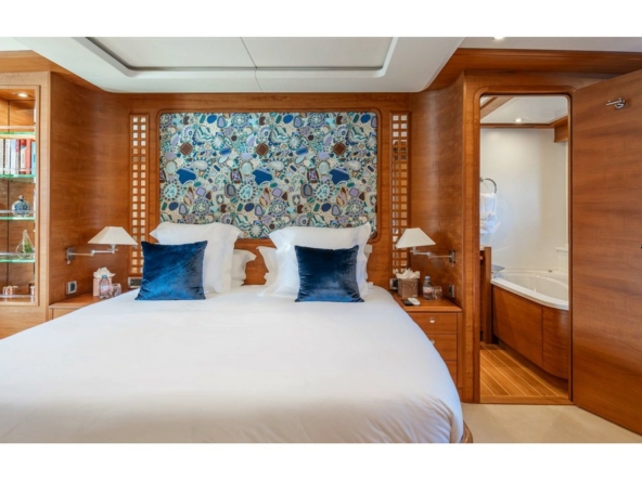 The owner's cabin spans the full beam amidships. It is furnished with a king-size bed, sofa, vanity, large wardrobes, and a bathroom with a shower, bathtub, and separate toilet.