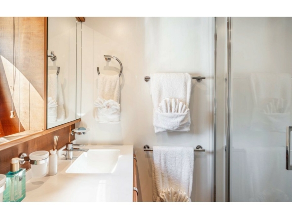 Each cabin has its own sound system, built-in television, and two sinks per bathroom.