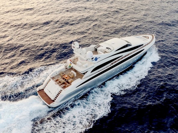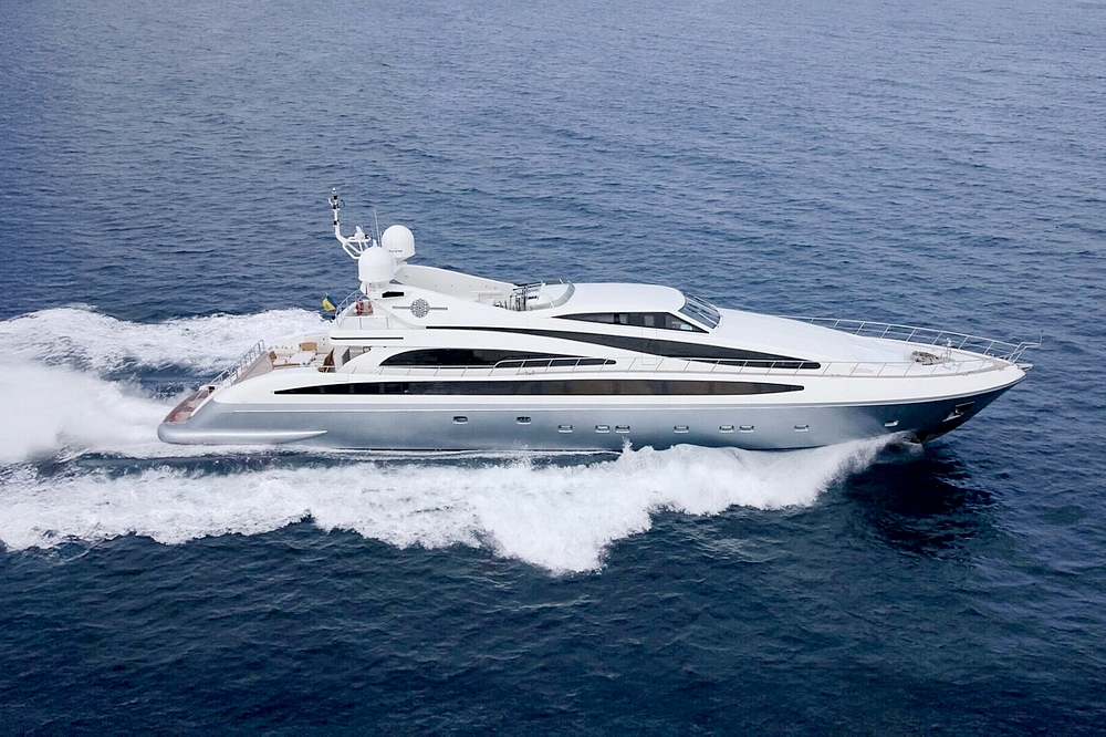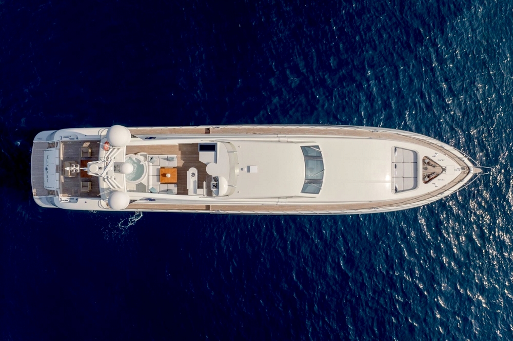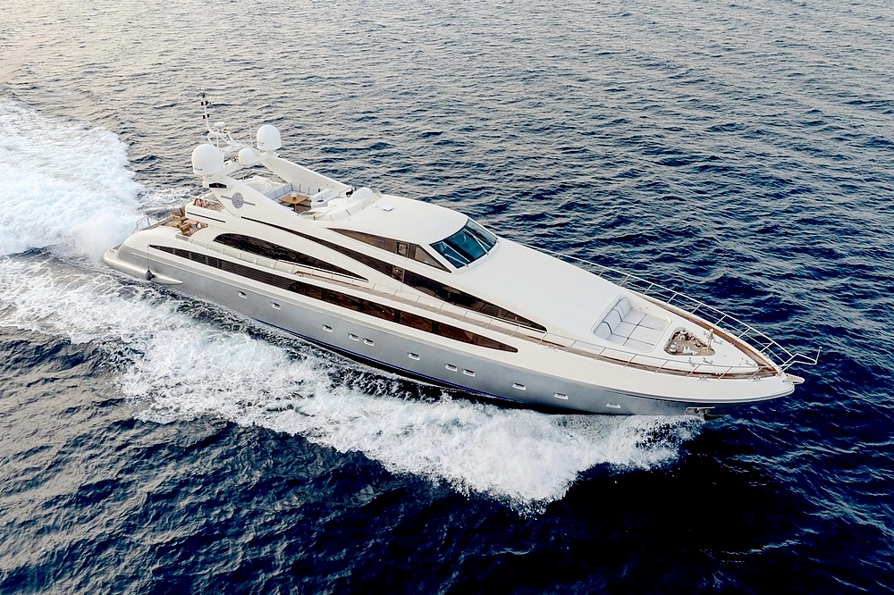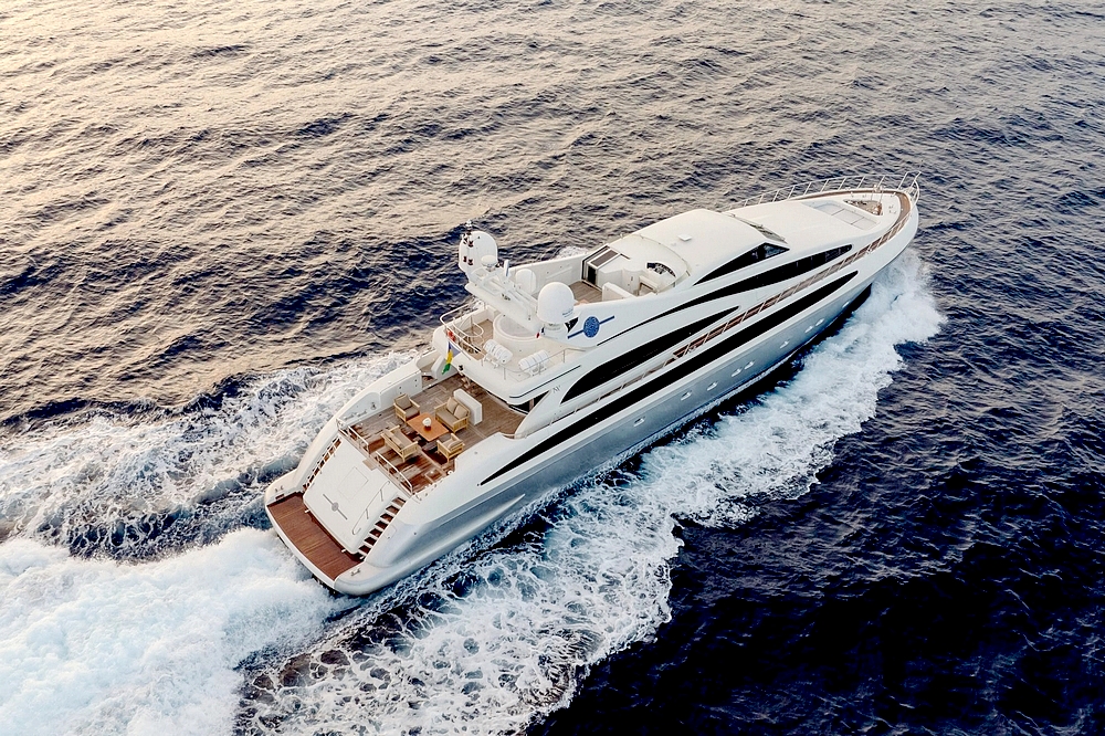 The sporty exterior design of this very spacious yacht with bold lines, designed and built in GRP by the renowned Italian ISA Yachts shipyard, is matched by exhilarating performance. The metallic gray hull color adds a modern touch, typical of Italian craftsmanship. Her KaMeWa waterjet drives provide excellent maneuverability and a shallow draft, allowing access to shallow waters.