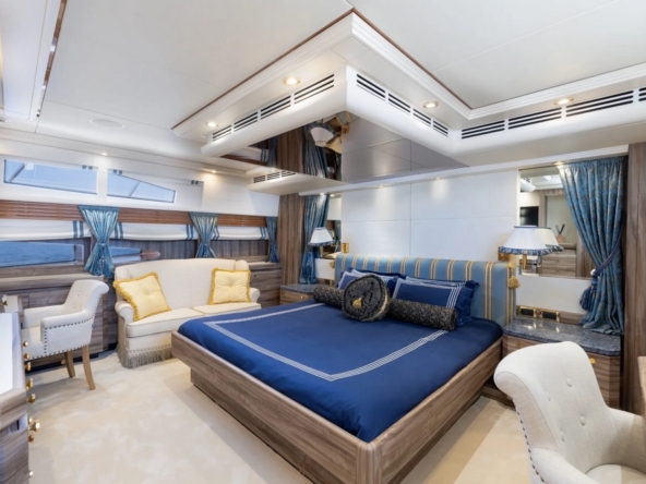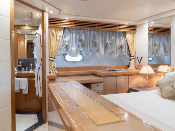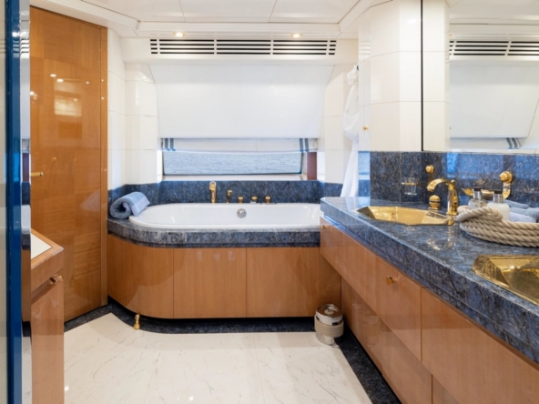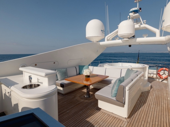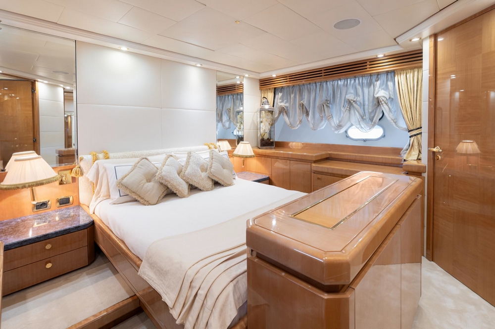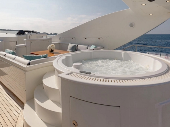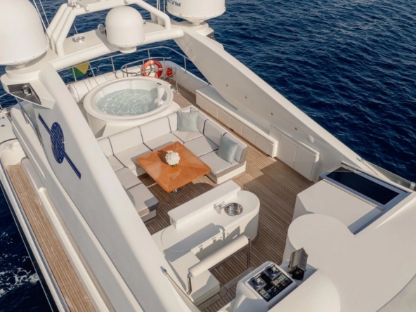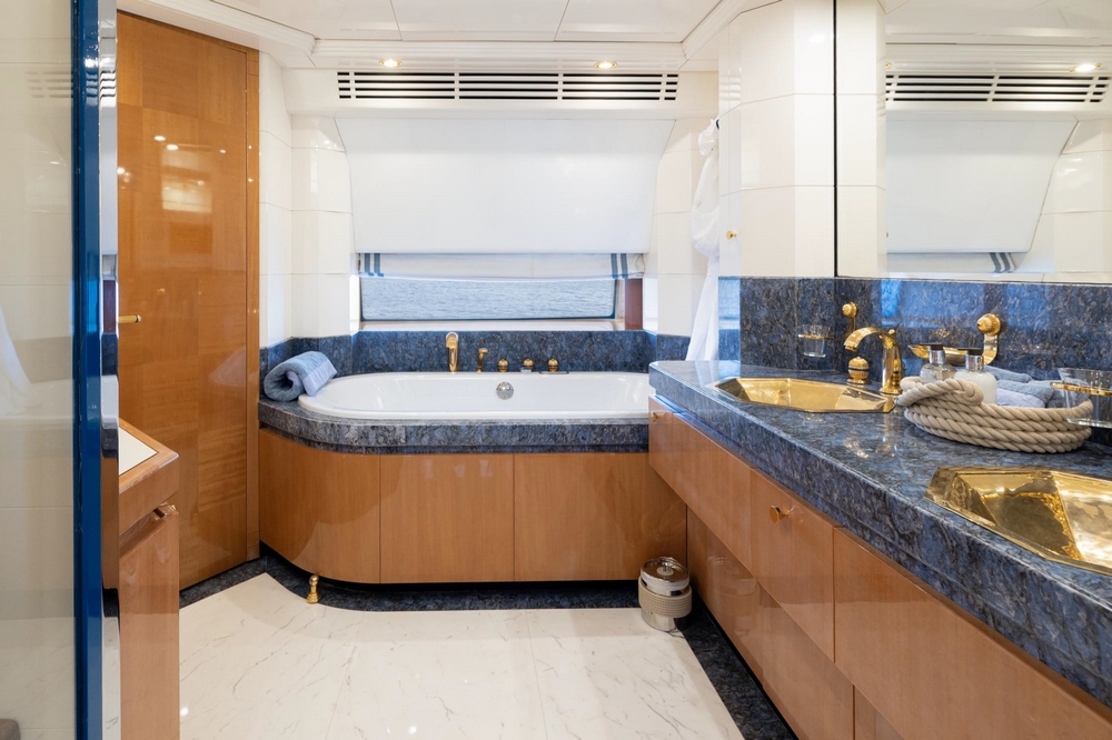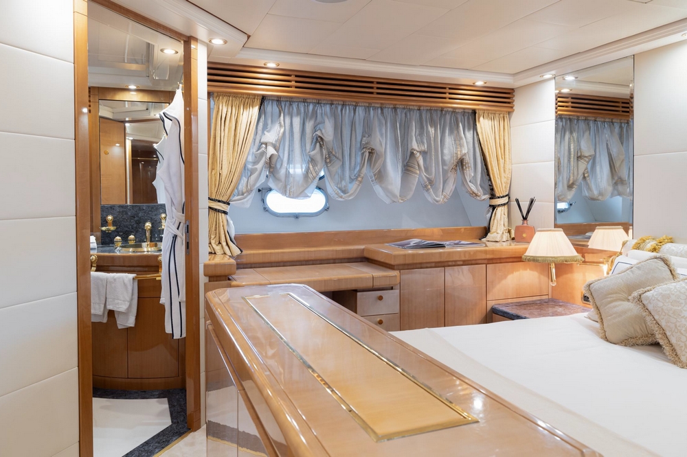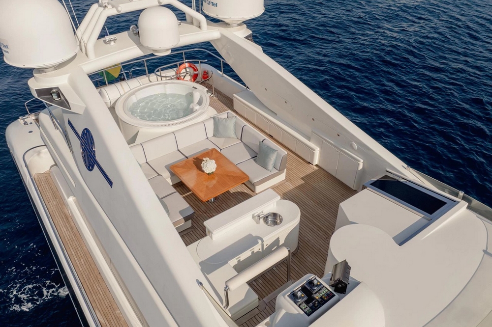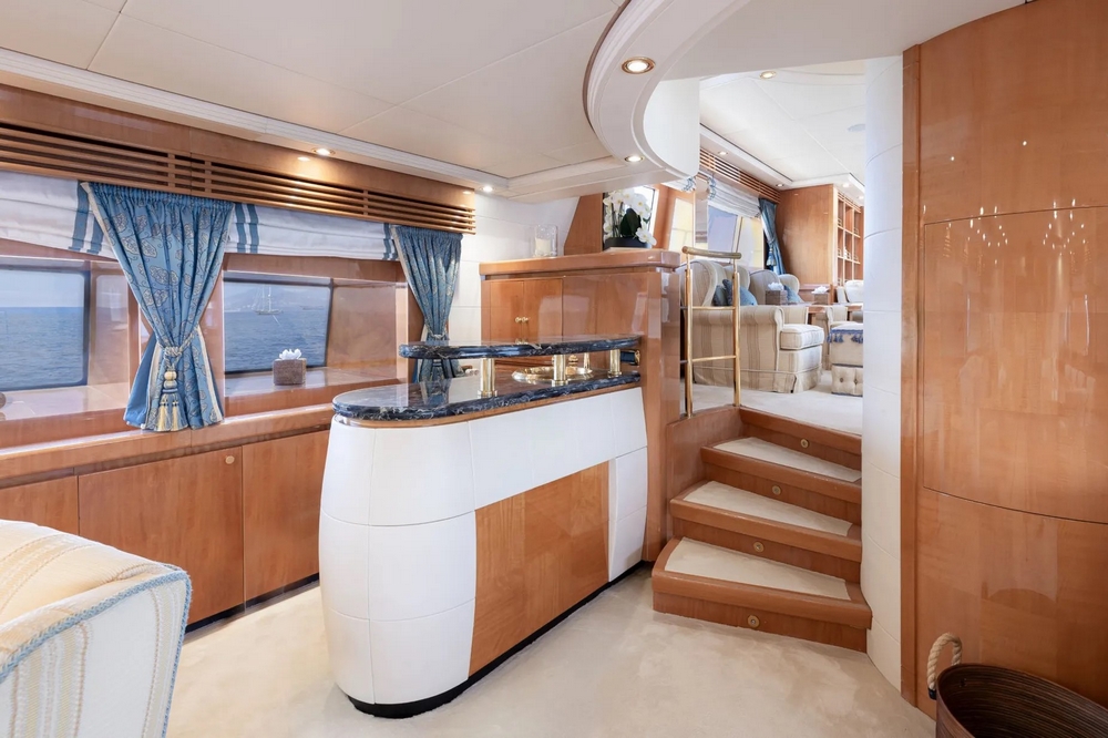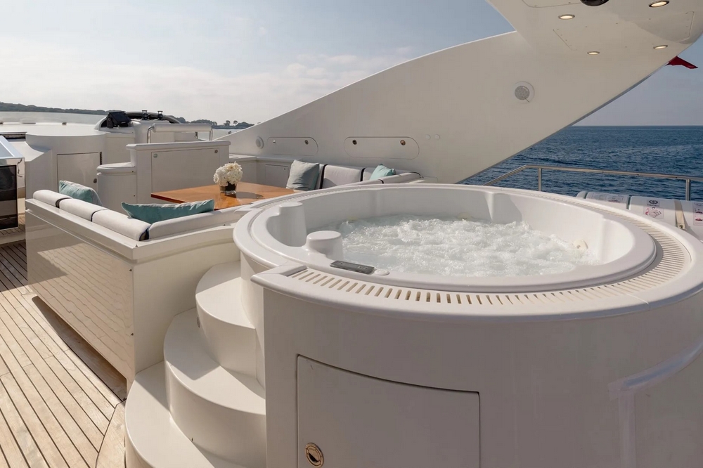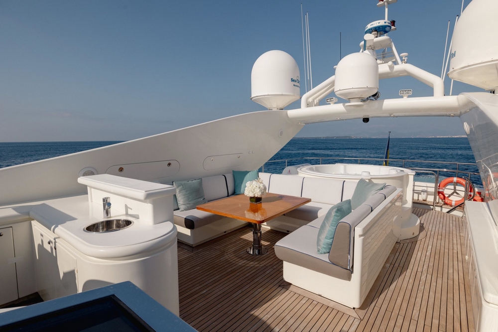 Her flybridge, topped by an elegant antenna arch, is very welcoming. It features a circular jacuzzi aft, a dining area with a U-shaped bench seat around a beautiful square teak table, and a bar with a sink, refrigerator, and icemaker. The pilot station is to starboard.