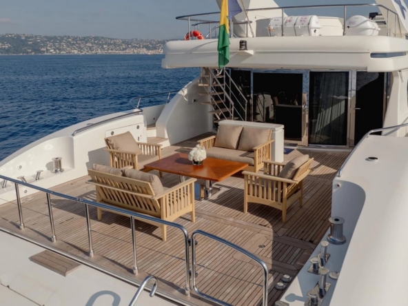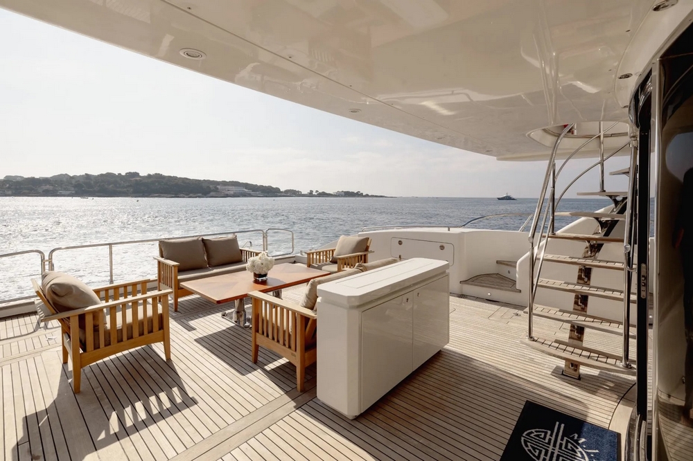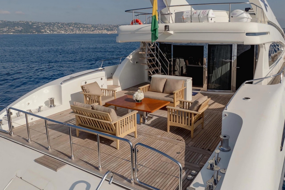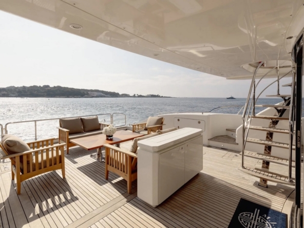 A saloon/dining area is located in the cockpit. It consists of a rectangular teak table surrounded by two sofas and two armchairs, as well as a bar cabinet. Two staircases, on either side of the garage door, provide easy access to the wide swimming platform.