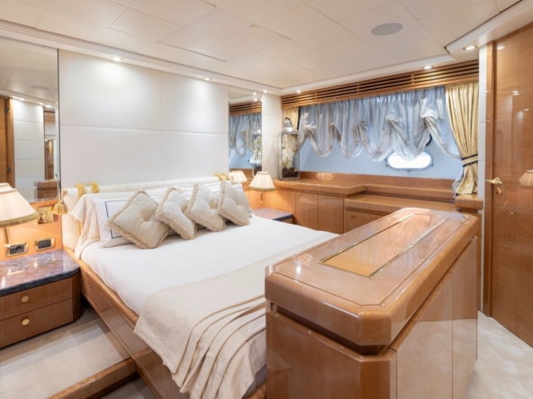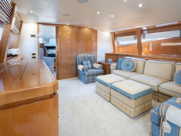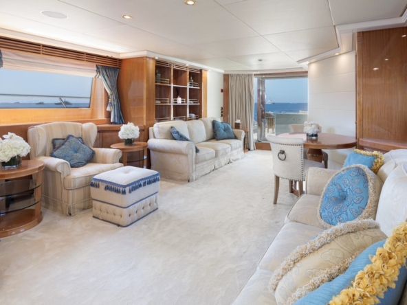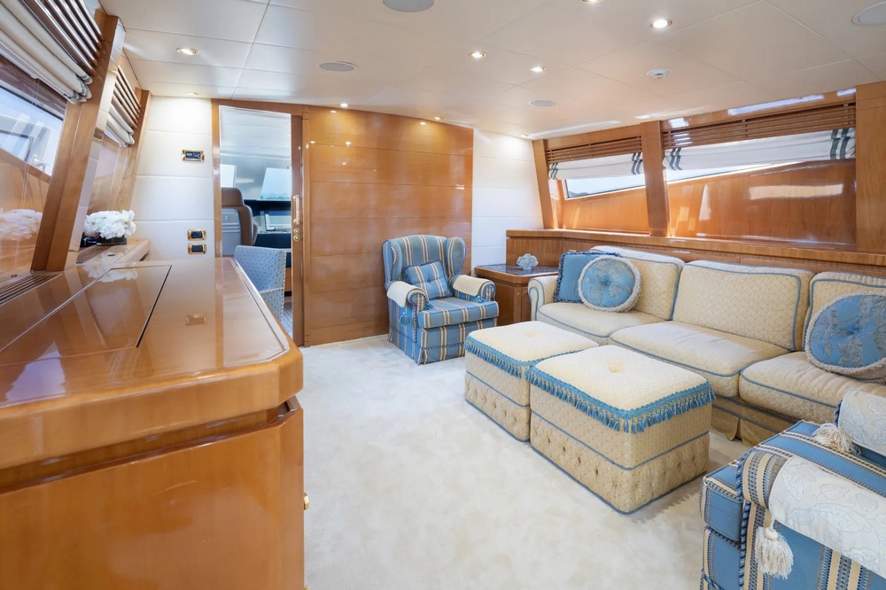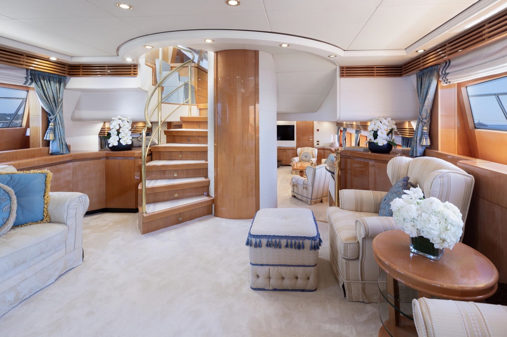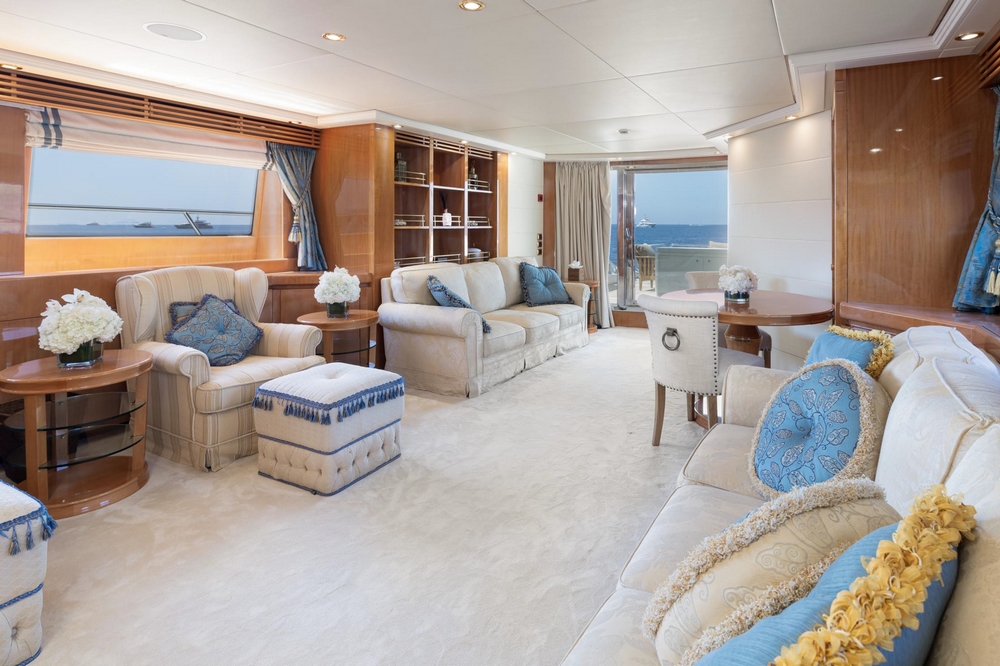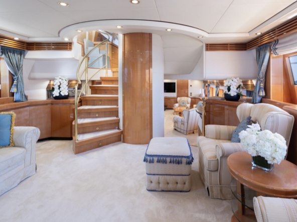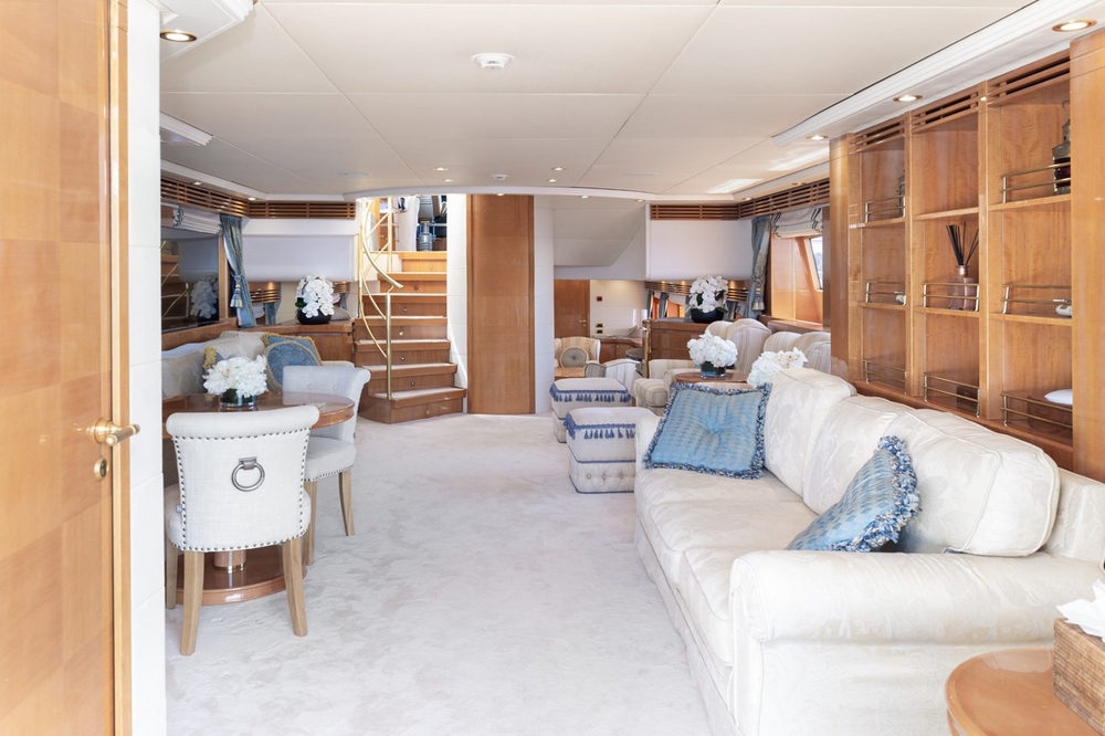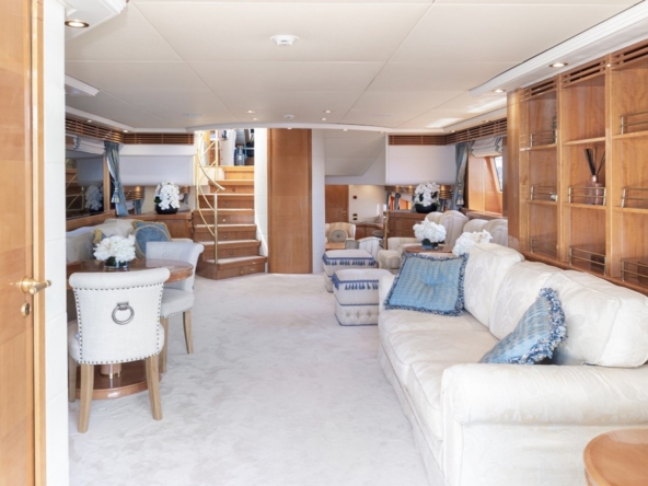 A large semicircular bay window provides access to the interior of the main deck. The sophisticated interiors are by Italian designer Cristiano Gatto. The light woodwork is enhanced by the white ceilings and carpets, and the luxurious upholstery. These generous spaces, with their timeless charm, are flooded with natural light through the large side windows.