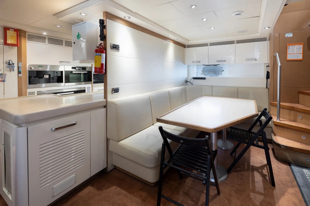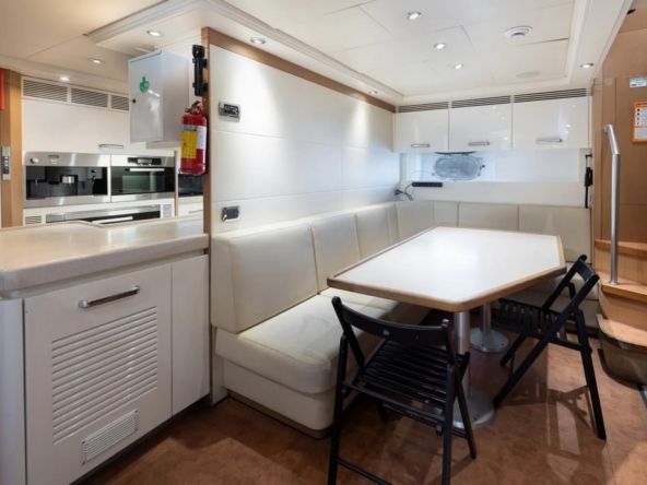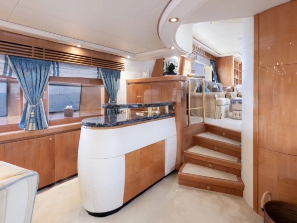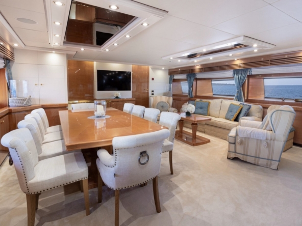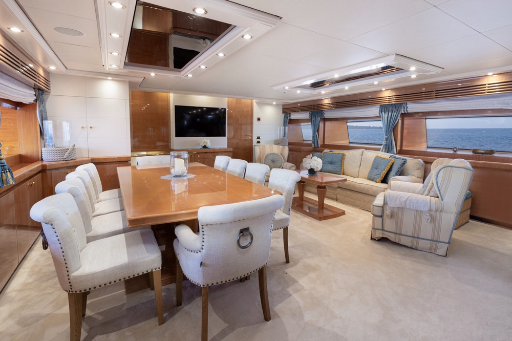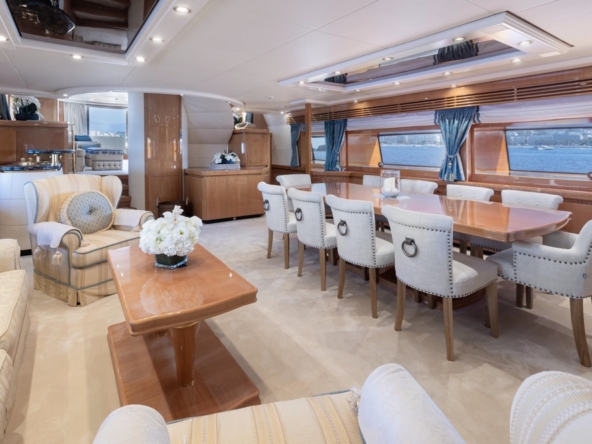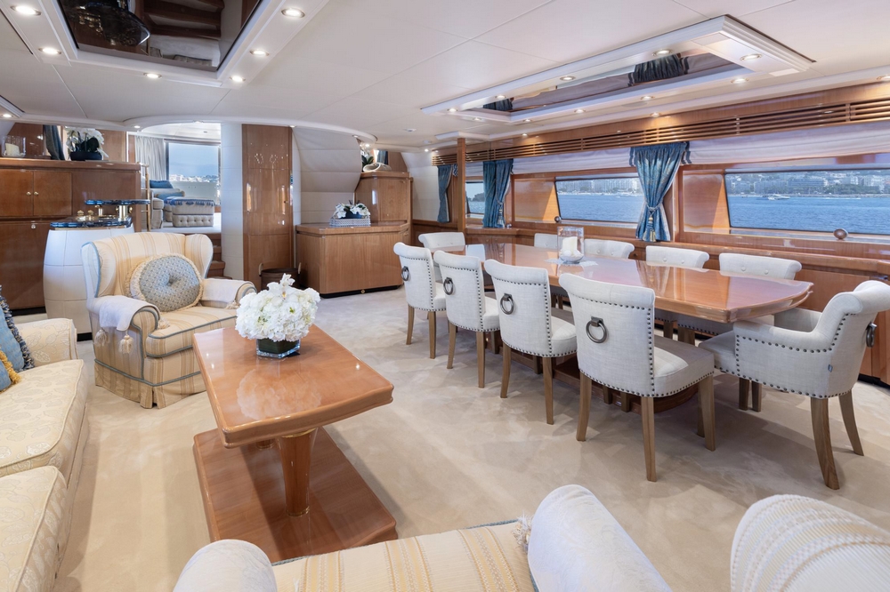 At the foot of these steps, a bar precedes the second saloon, consisting of a coffee table surrounded by a sofa and two armchairs. The port side is entirely occupied by the large dining room which can comfortably seat ten guests.