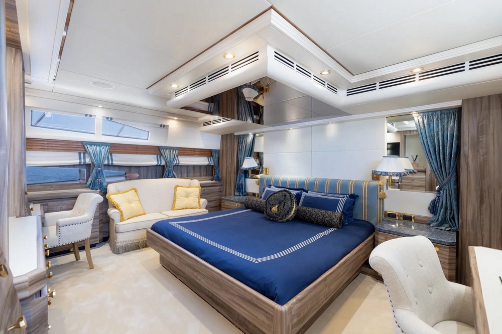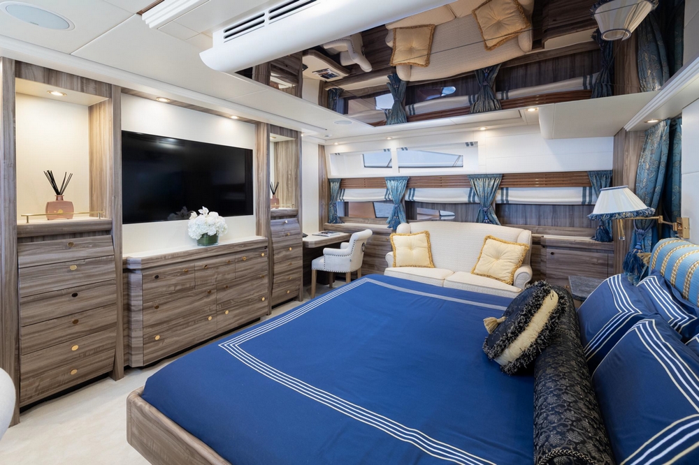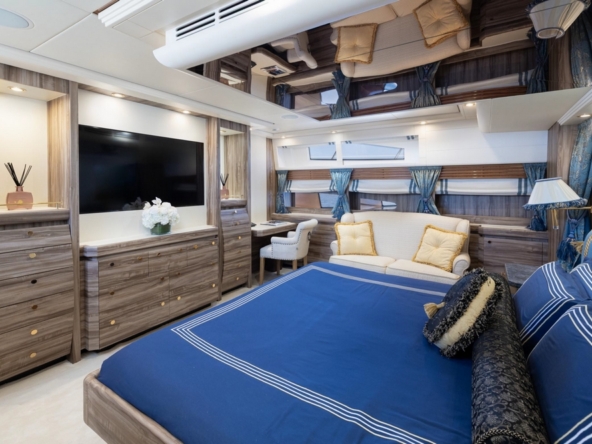 Forward, the owner's suite is immense. It is furnished with a central king-size bed facing the large television, a sofa, a vanity table, a desk, a dressing room, ample storage, and a spacious bathroom with two sinks, shower and bathtub, toilet, and a bidet.