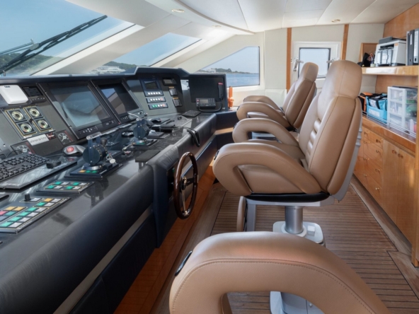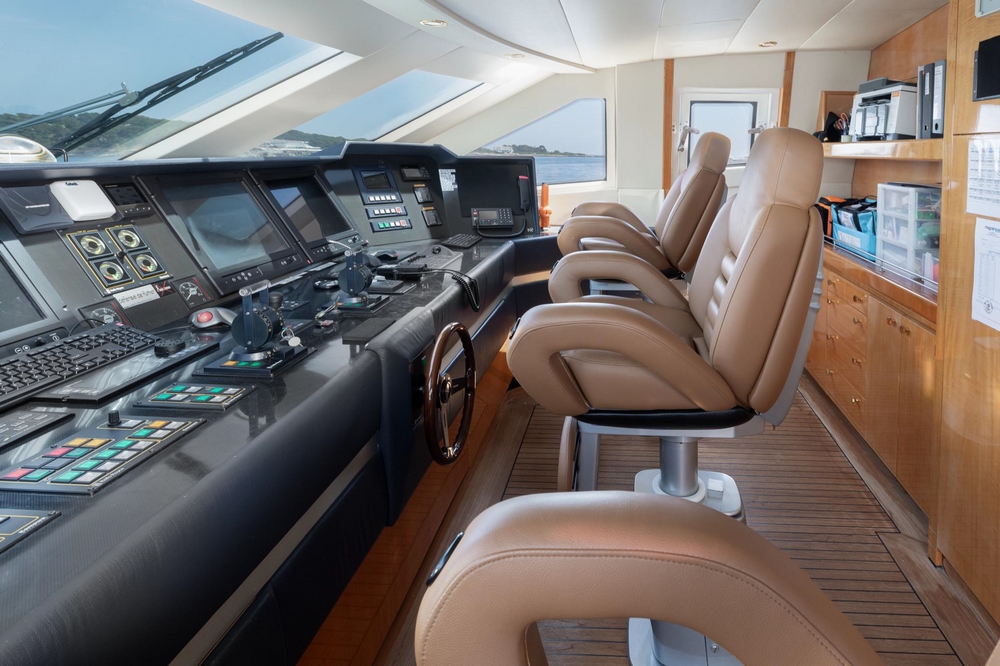 The upper deck offers a third saloon, with a sofa and two armchairs around two coffee tables, facing an audio-visual unit and a desk. This area has direct access to the flybridge aft and the wheelhouse forward. The latter is sumptuous, with its full-width instrument console, steering wheel, three comfortable helm chairs, and direct access to the gangways via two watertight doors.