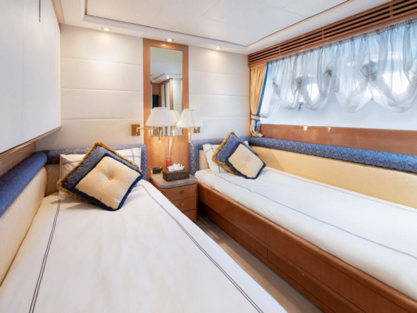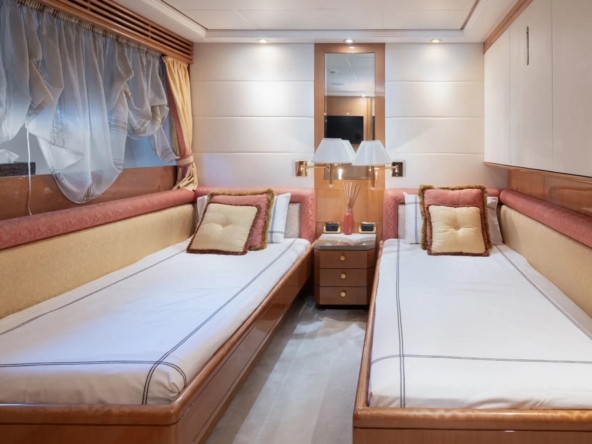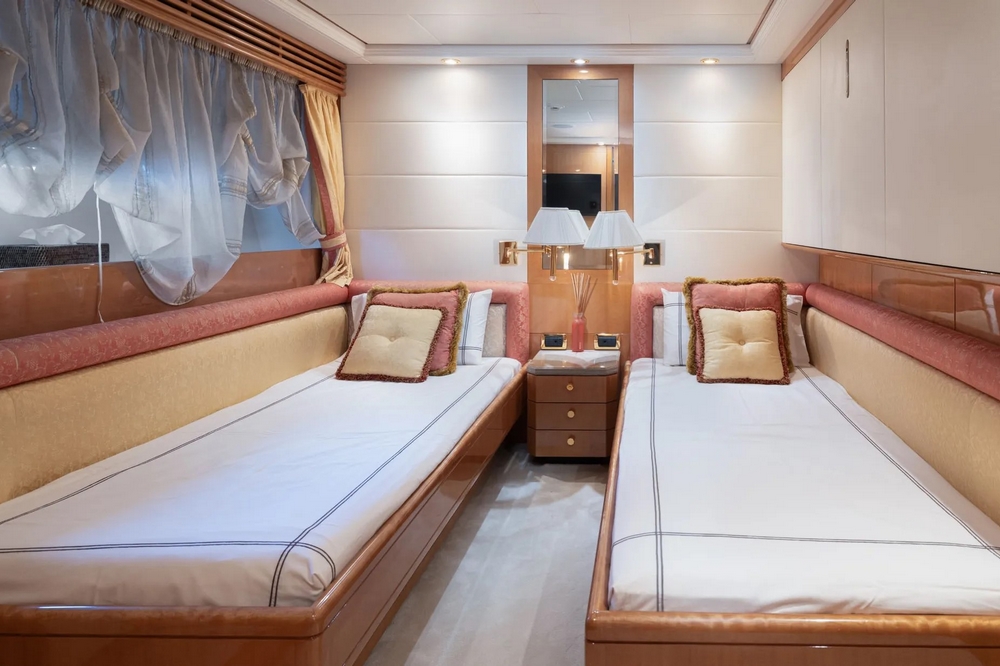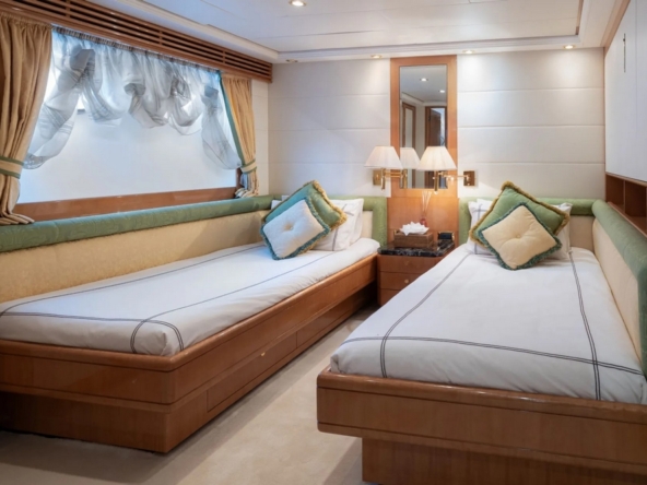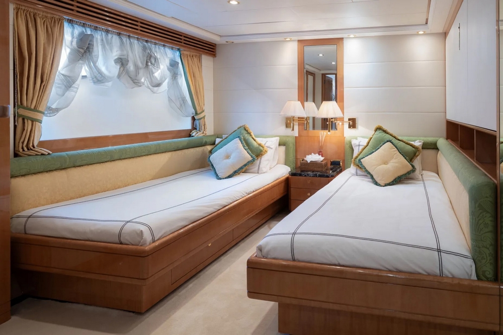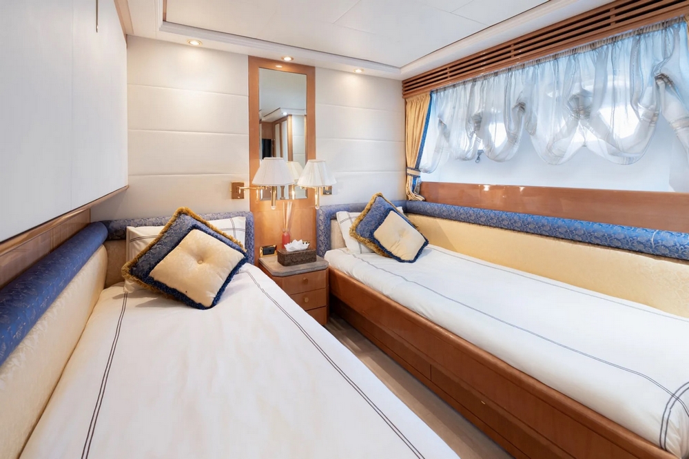 . The midships area is dedicated to the exceptionally spacious crew quarters. Accessed by a staircase from the