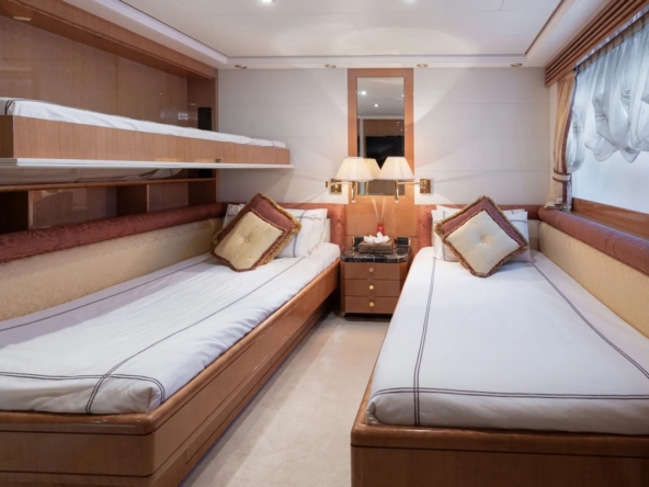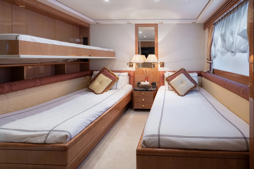 Three crew cabins with bunk beds, wardrobes, and en-suite bathrooms.