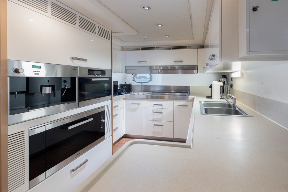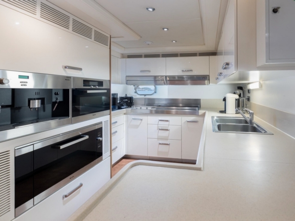 A large, modern U-shaped galley, all white and stainless-steel, fully equipped.