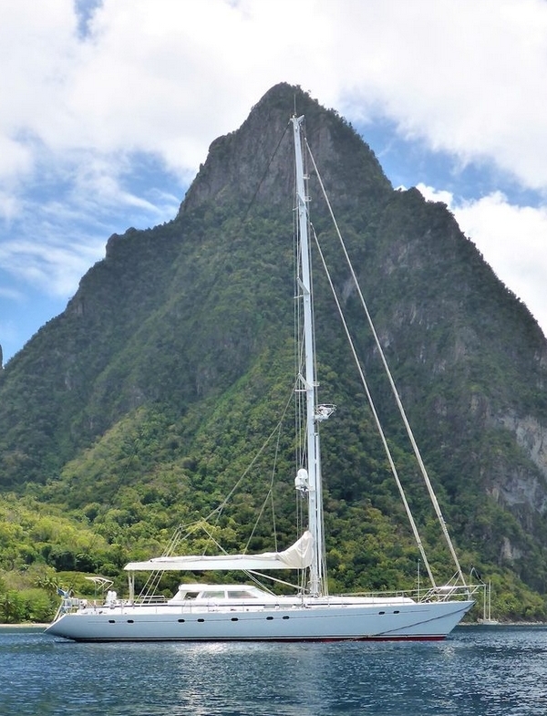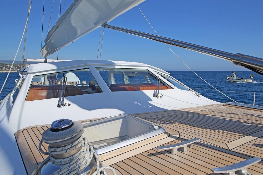 This sloop is easy to maneuver thanks to her high-tech equipment: Espace Composite carbon fiber mast and 'Park Avenue' boom, Rod rigging, Hydromar hydraulic boom vangs and backstays, Reckmann hydraulic furlers for the genoa and staysail, Doyle sails (150 m² full-batten mainsail + 200 m² genoa + 90 m² staysail), captive Hydromar winch for the mainsail halyard, and additional Lewmar winches (4 hydraulic + 8 manual).