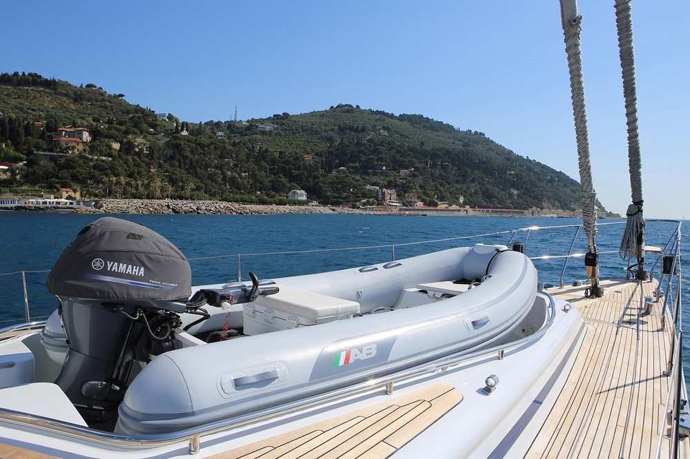 The dinghy is securely embedded in the foredeck.
