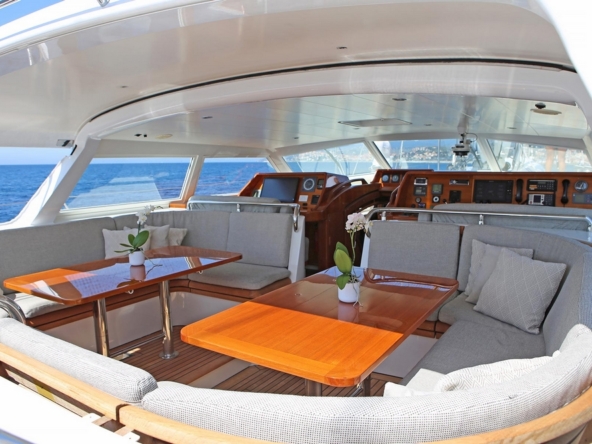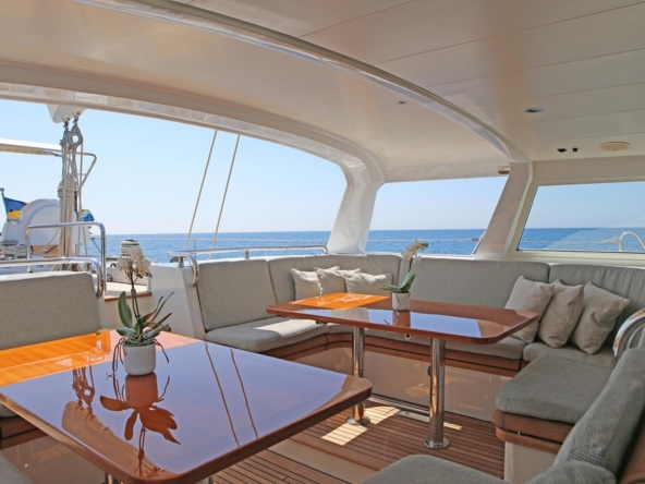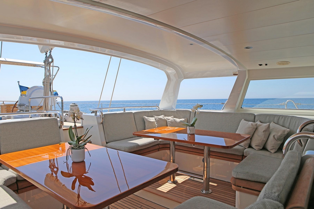 The unique design of the aft deck, with its semi-enclosed cockpit, well-sheltered for sailing in all weather conditions, makes it the ideal choice for sailing in both high latitudes and the tropics. The aft section of the roof slides electrically forward, revealing the very inviting deck saloon. It features two U-shaped sofas around two teak tables, and the navigation station, well sheltered behind the windshield.