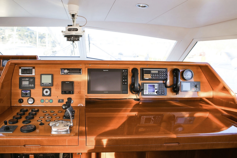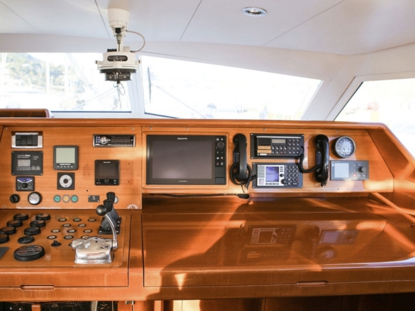 The aft section of the cockpit consists of a teak-slatted platform that can accommodate a sunbathing or lounge chairs, and then the two helm stations. These are magnificent, with imposing instrument consoles, large steering wheels, comfortable helm seats with backrests, and protected by biminis.