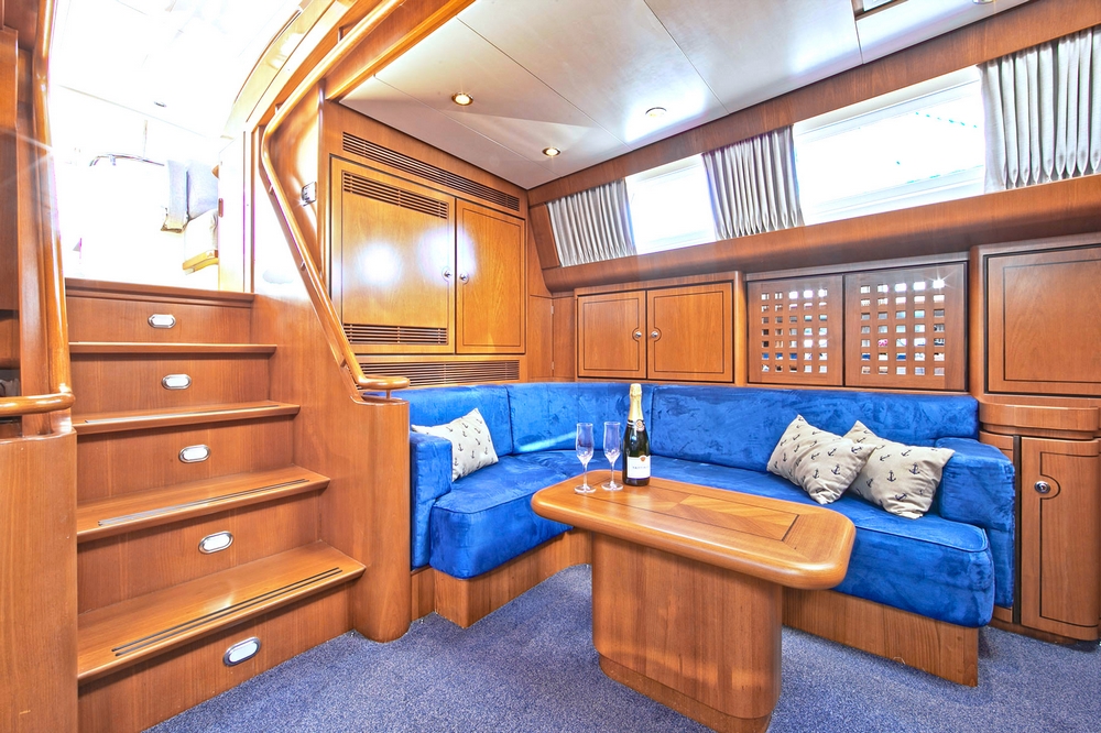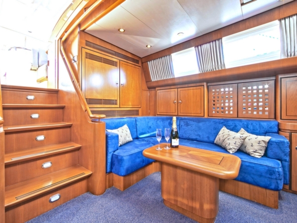 A staircase leads to the middle deck, which houses the saloon, dining room, galley, and crew quarters. The layout is spacious and comfortable, with blue upholstery and carpeting, and beautiful, warm varnished teak woodwork: