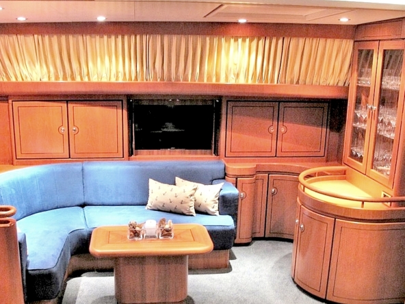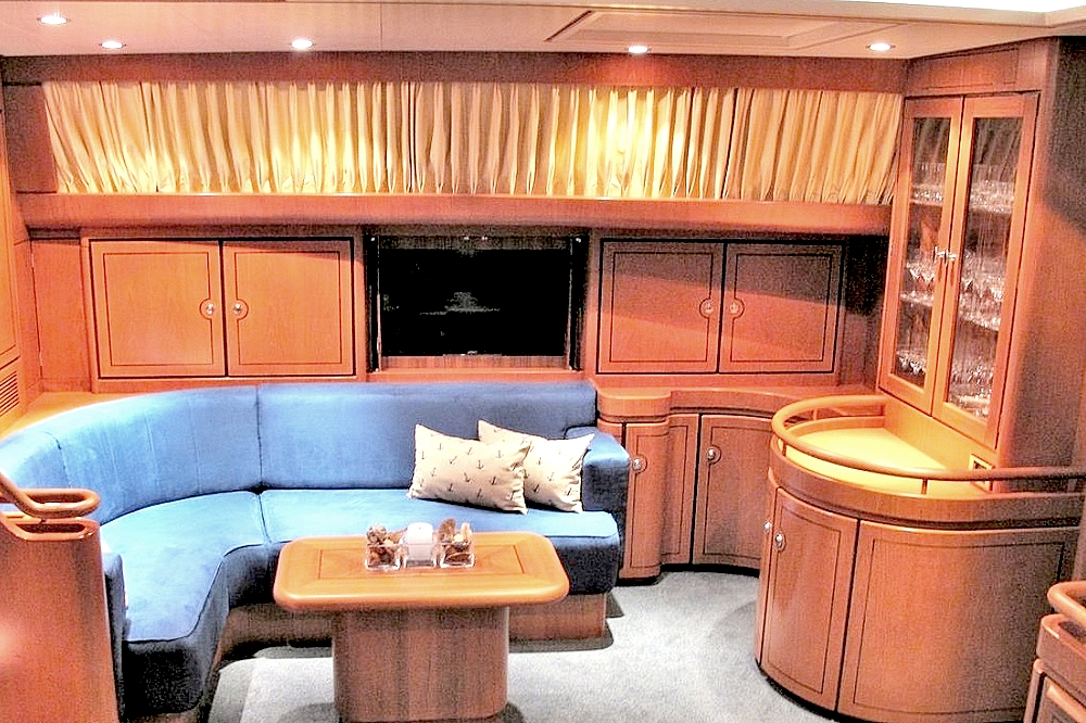 . To port, the saloon features an L-shaped sofa, coffee table, built-in 27-inch television, Bose sound system, and