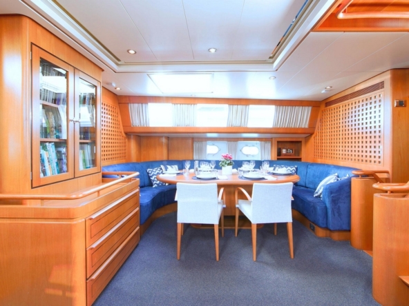 . To starboard, the spacious dining room seats eight and features a beautiful teak table surrounded by a U-