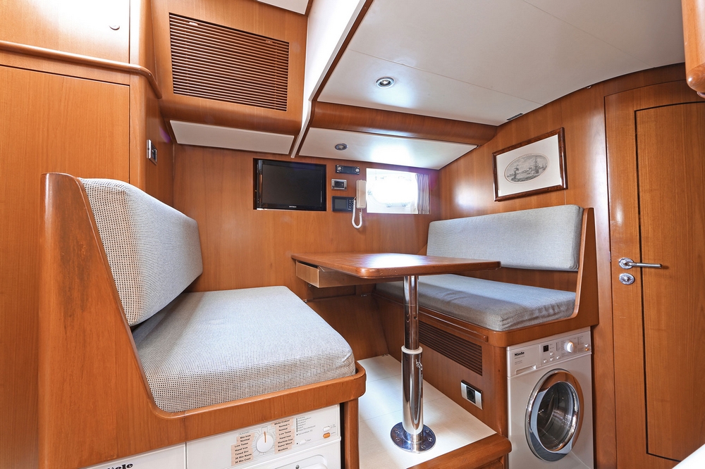 . Opposite the galley, to port, is the crew mess, with a table, two settees, Miele washing machine and dryer.